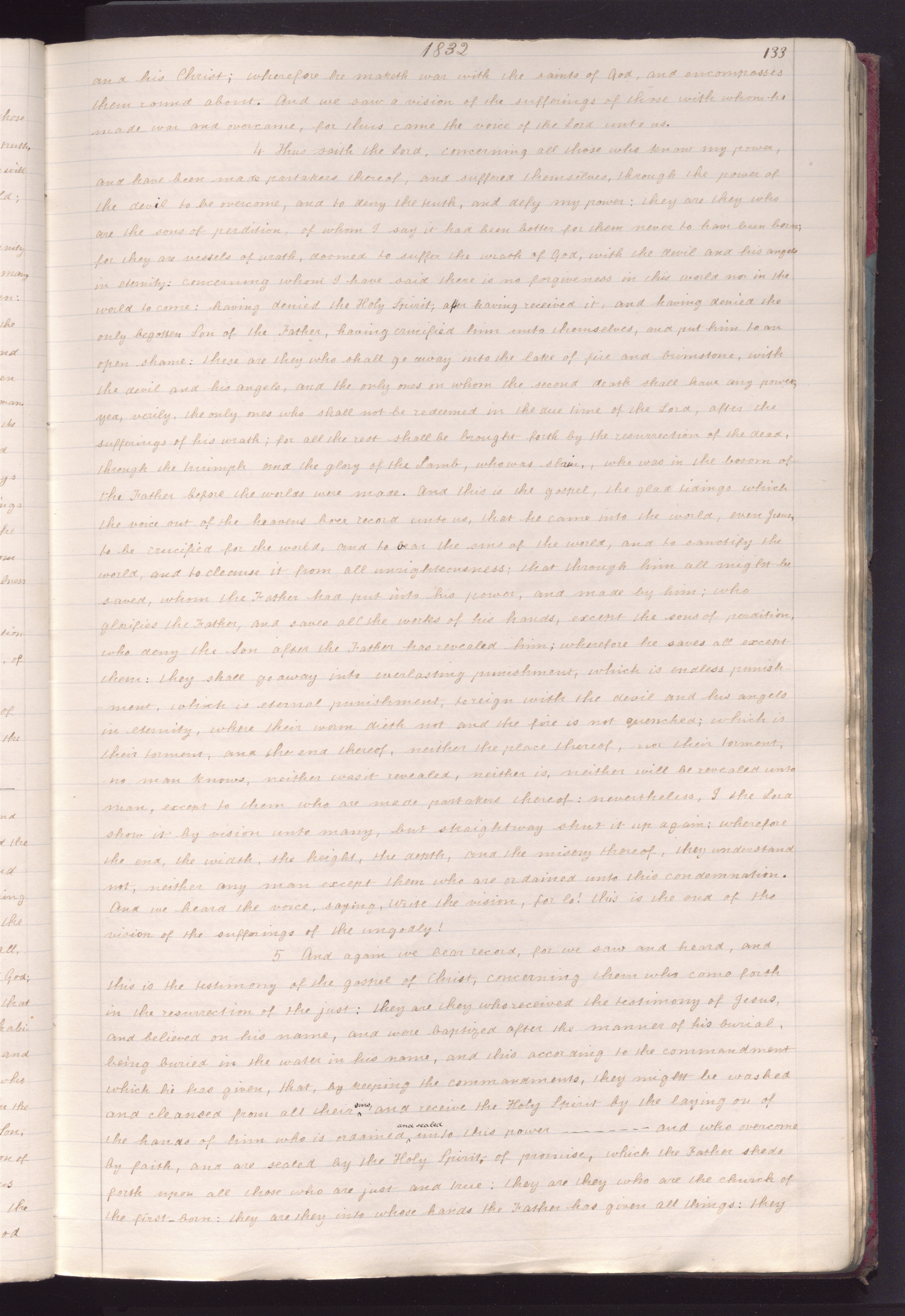 JS, History, 1838–1856, vol. A-2, created 4 Apr.–28 Nov. 1845 and 3–7 Aug. 1858; handwriting of , , , and ; 365 pages, plus seven pages of addenda; CHL. This is a copy of the first volume of a six-volume manuscript history of the church (JS History, 1838–1856, vol. A-1), and covers the period from 23 Dec. 1805 to 30 Aug. 1834. The copy also comprises four other volumes, labeled B-2, C-2, D-2, and E-2, and continues through 19 July 1843. The copy was discontinued 6 Aug. 1856 “by the advice of President ” (JS History, 1838–1856, vol. E-2, p. 83).