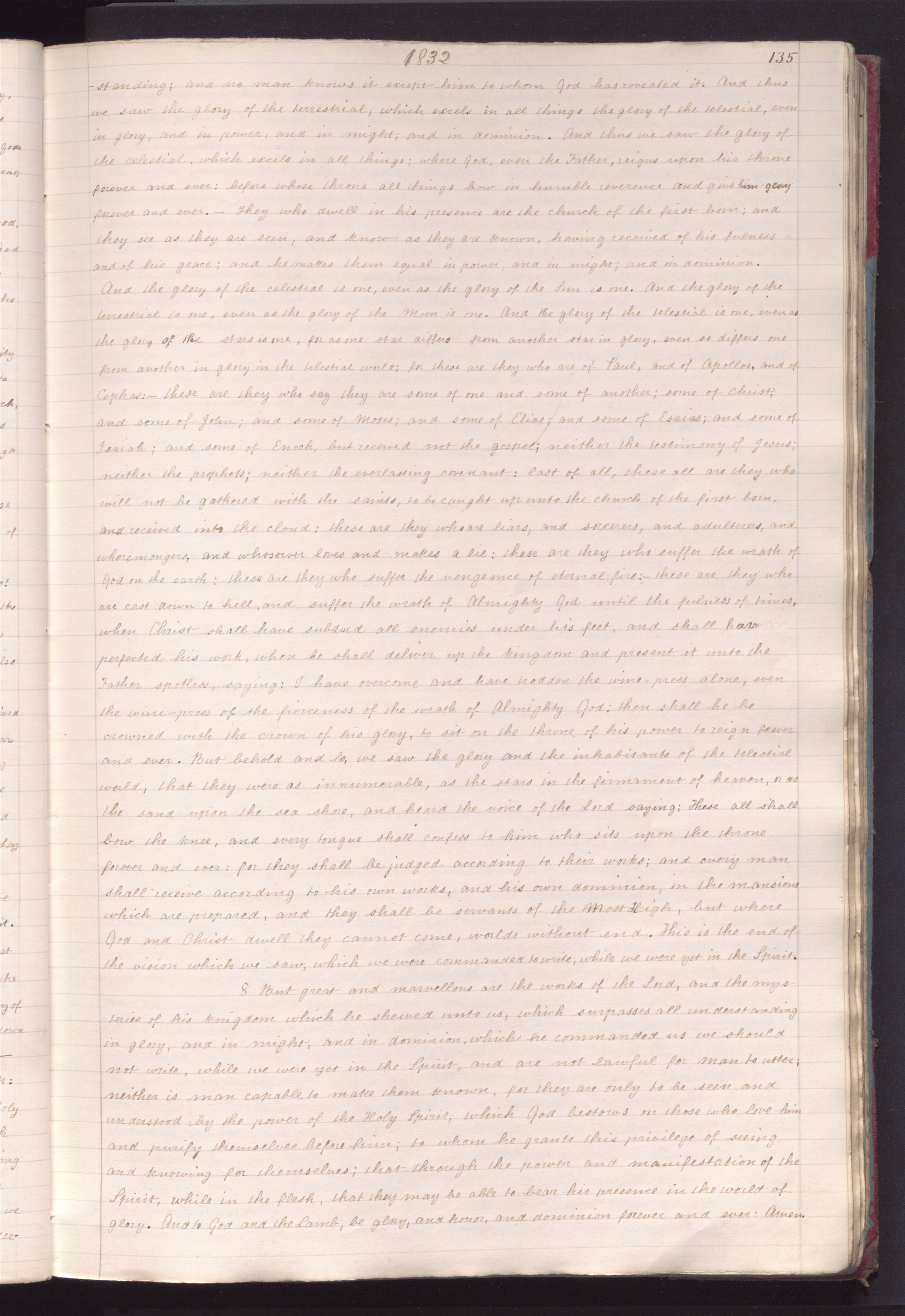 JS, History, 1838–1856, vol. A-2, created 4 Apr.–28 Nov. 1845 and 3–7 Aug. 1858; handwriting of , , , and ; 365 pages, plus seven pages of addenda; CHL. This is a copy of the first volume of a six-volume manuscript history of the church (JS History, 1838–1856, vol. A-1), and covers the period from 23 Dec. 1805 to 30 Aug. 1834. The copy also comprises four other volumes, labeled B-2, C-2, D-2, and E-2, and continues through 19 July 1843. The copy was discontinued 6 Aug. 1856 “by the advice of President ” (JS History, 1838–1856, vol. E-2, p. 83).