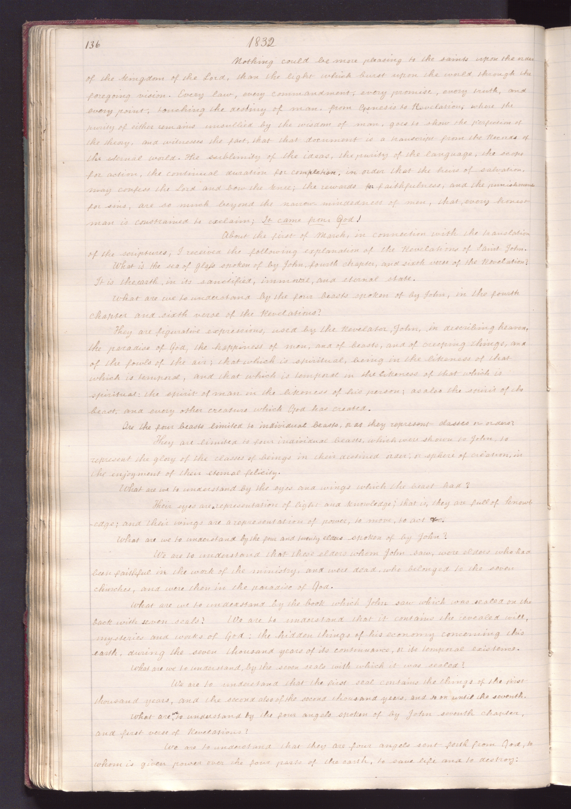 JS, History, 1838–1856, vol. A-2, created 4 Apr.–28 Nov. 1845 and 3–7 Aug. 1858; handwriting of , , , and ; 365 pages, plus seven pages of addenda; CHL. This is a copy of the first volume of a six-volume manuscript history of the church (JS History, 1838–1856, vol. A-1), and covers the period from 23 Dec. 1805 to 30 Aug. 1834. The copy also comprises four other volumes, labeled B-2, C-2, D-2, and E-2, and continues through 19 July 1843. The copy was discontinued 6 Aug. 1856 “by the advice of President ” (JS History, 1838–1856, vol. E-2, p. 83).