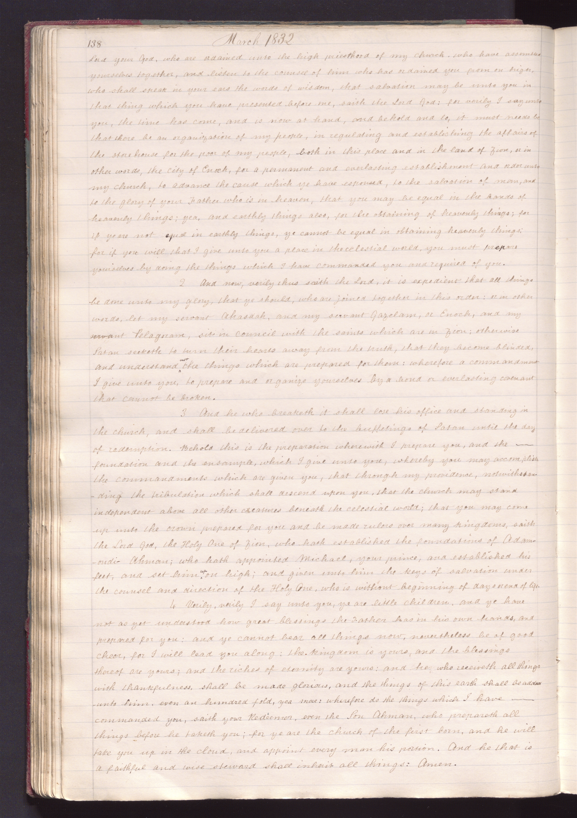 JS, History, 1838–1856, vol. A-2, created 4 Apr.–28 Nov. 1845 and 3–7 Aug. 1858; handwriting of , , , and ; 365 pages, plus seven pages of addenda; CHL. This is a copy of the first volume of a six-volume manuscript history of the church (JS History, 1838–1856, vol. A-1), and covers the period from 23 Dec. 1805 to 30 Aug. 1834. The copy also comprises four other volumes, labeled B-2, C-2, D-2, and E-2, and continues through 19 July 1843. The copy was discontinued 6 Aug. 1856 “by the advice of President ” (JS History, 1838–1856, vol. E-2, p. 83).