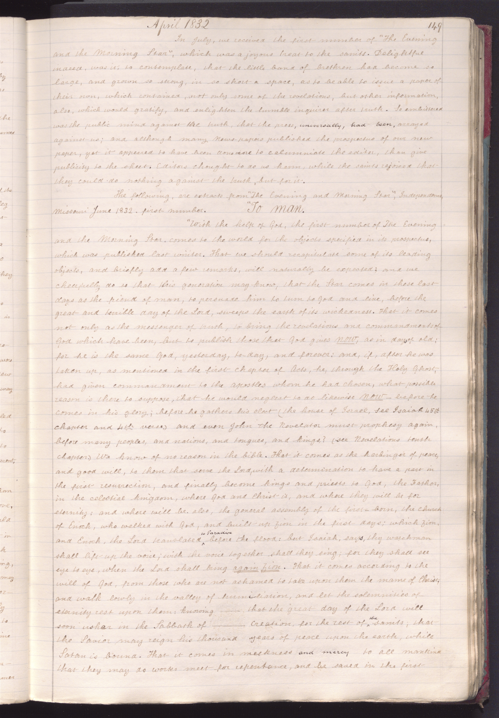 JS, History, 1838–1856, vol. A-2, created 4 Apr.–28 Nov. 1845 and 3–7 Aug. 1858; handwriting of , , , and ; 365 pages, plus seven pages of addenda; CHL. This is a copy of the first volume of a six-volume manuscript history of the church (JS History, 1838–1856, vol. A-1), and covers the period from 23 Dec. 1805 to 30 Aug. 1834. The copy also comprises four other volumes, labeled B-2, C-2, D-2, and E-2, and continues through 19 July 1843. The copy was discontinued 6 Aug. 1856 “by the advice of President ” (JS History, 1838–1856, vol. E-2, p. 83).