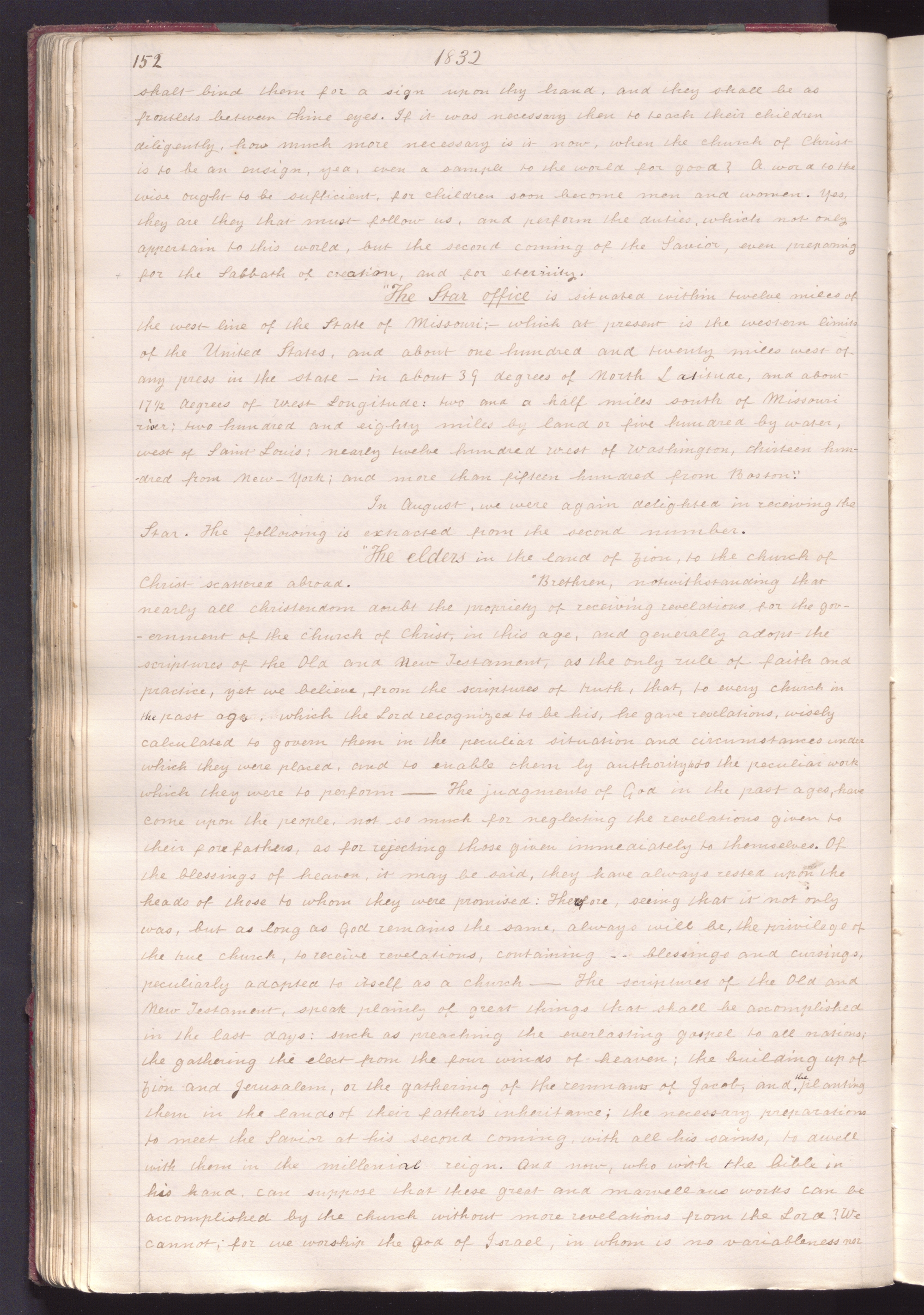 JS, History, 1838–1856, vol. A-2, created 4 Apr.–28 Nov. 1845 and 3–7 Aug. 1858; handwriting of , , , and ; 365 pages, plus seven pages of addenda; CHL. This is a copy of the first volume of a six-volume manuscript history of the church (JS History, 1838–1856, vol. A-1), and covers the period from 23 Dec. 1805 to 30 Aug. 1834. The copy also comprises four other volumes, labeled B-2, C-2, D-2, and E-2, and continues through 19 July 1843. The copy was discontinued 6 Aug. 1856 “by the advice of President ” (JS History, 1838–1856, vol. E-2, p. 83).