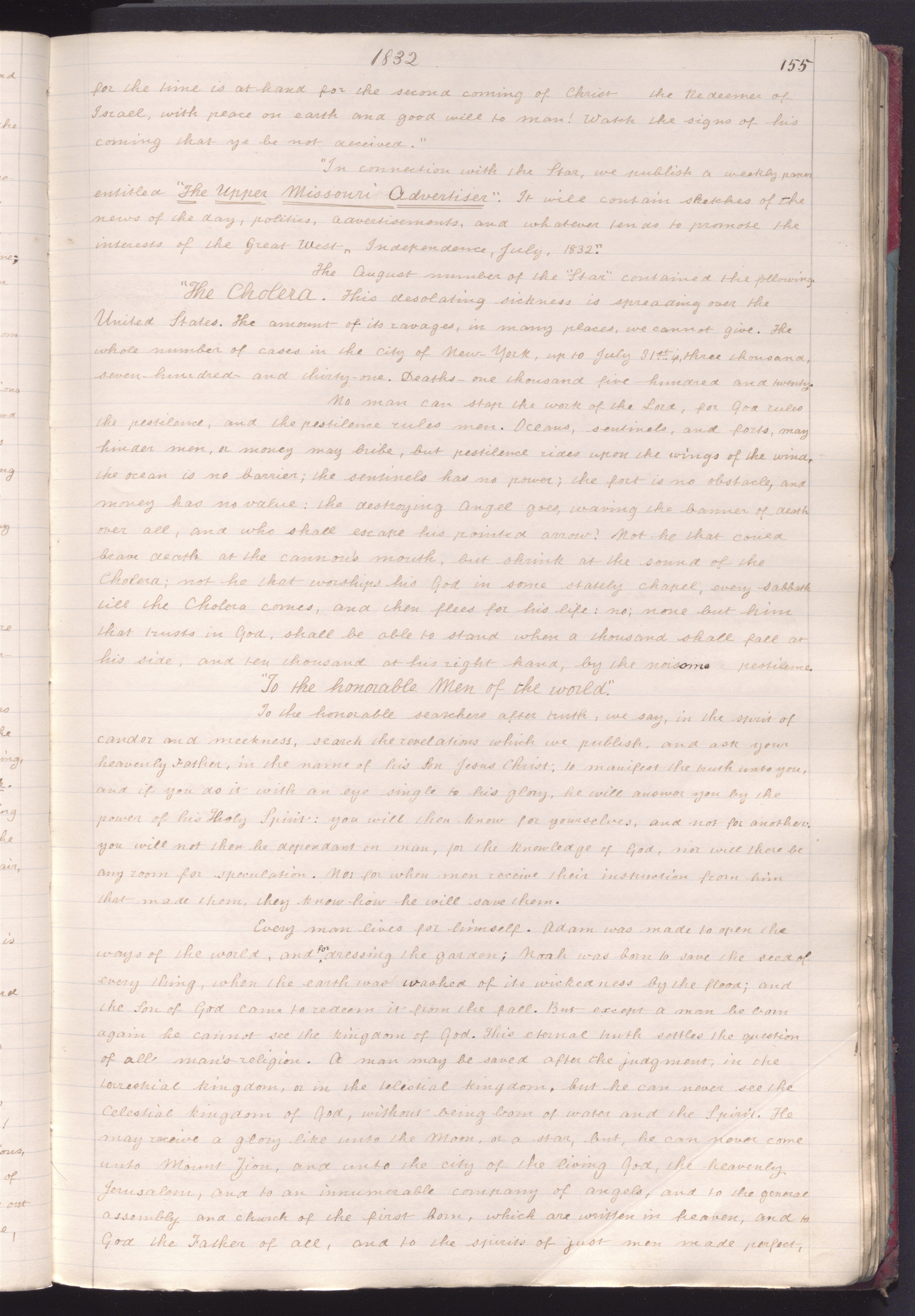 JS, History, 1838–1856, vol. A-2, created 4 Apr.–28 Nov. 1845 and 3–7 Aug. 1858; handwriting of , , , and ; 365 pages, plus seven pages of addenda; CHL. This is a copy of the first volume of a six-volume manuscript history of the church (JS History, 1838–1856, vol. A-1), and covers the period from 23 Dec. 1805 to 30 Aug. 1834. The copy also comprises four other volumes, labeled B-2, C-2, D-2, and E-2, and continues through 19 July 1843. The copy was discontinued 6 Aug. 1856 “by the advice of President ” (JS History, 1838–1856, vol. E-2, p. 83).