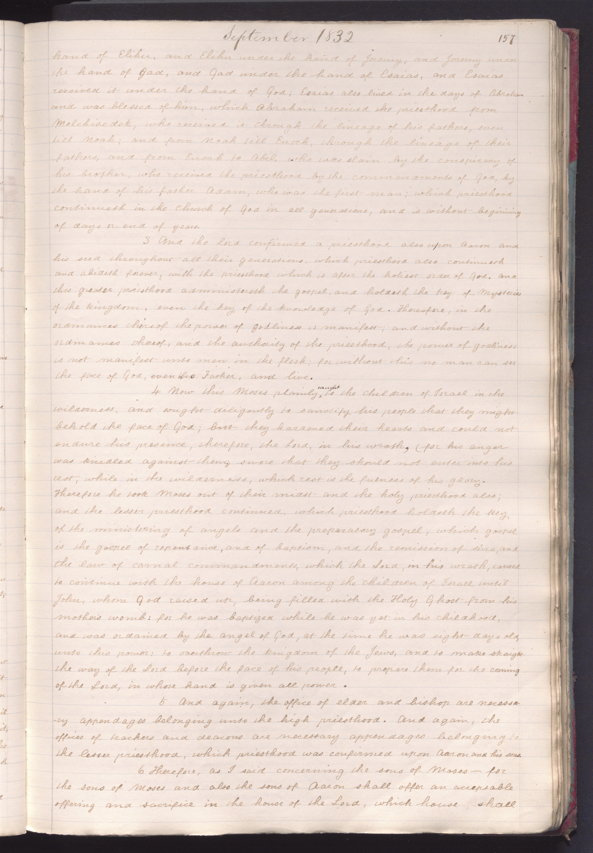 JS, History, 1838–1856, vol. A-2, created 4 Apr.–28 Nov. 1845 and 3–7 Aug. 1858; handwriting of , , , and ; 365 pages, plus seven pages of addenda; CHL. This is a copy of the first volume of a six-volume manuscript history of the church (JS History, 1838–1856, vol. A-1), and covers the period from 23 Dec. 1805 to 30 Aug. 1834. The copy also comprises four other volumes, labeled B-2, C-2, D-2, and E-2, and continues through 19 July 1843. The copy was discontinued 6 Aug. 1856 “by the advice of President ” (JS History, 1838–1856, vol. E-2, p. 83).