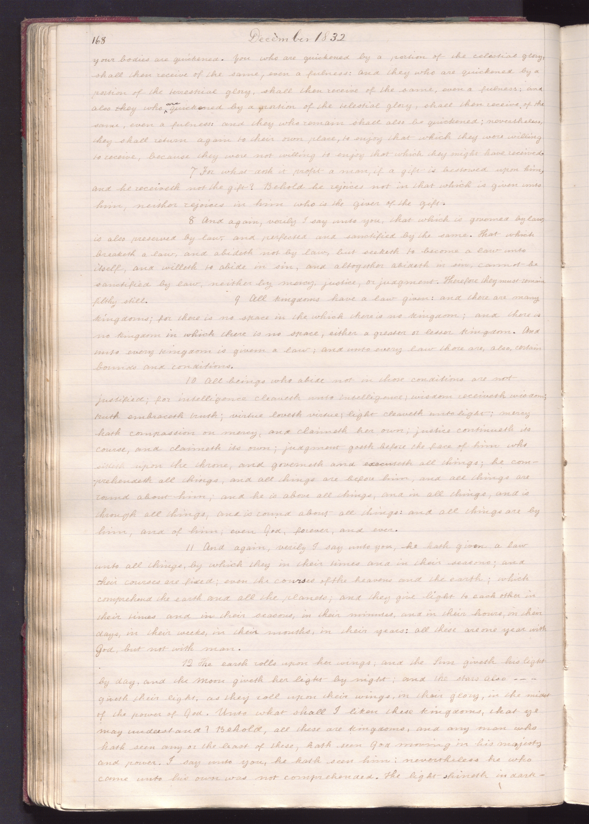 JS, History, 1838–1856, vol. A-2, created 4 Apr.–28 Nov. 1845 and 3–7 Aug. 1858; handwriting of , , , and ; 365 pages, plus seven pages of addenda; CHL. This is a copy of the first volume of a six-volume manuscript history of the church (JS History, 1838–1856, vol. A-1), and covers the period from 23 Dec. 1805 to 30 Aug. 1834. The copy also comprises four other volumes, labeled B-2, C-2, D-2, and E-2, and continues through 19 July 1843. The copy was discontinued 6 Aug. 1856 “by the advice of President ” (JS History, 1838–1856, vol. E-2, p. 83).