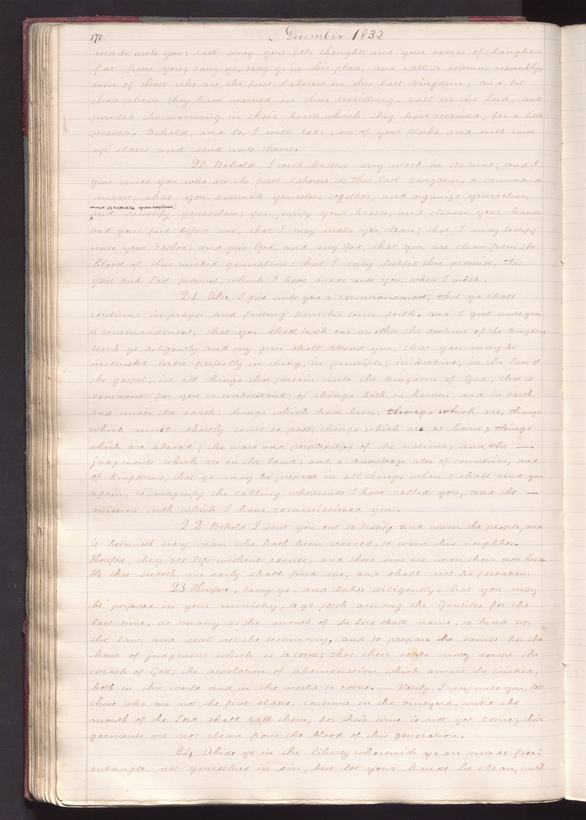 JS, History, 1838–1856, vol. A-2, created 4 Apr.–28 Nov. 1845 and 3–7 Aug. 1858; handwriting of , , , and ; 365 pages, plus seven pages of addenda; CHL. This is a copy of the first volume of a six-volume manuscript history of the church (JS History, 1838–1856, vol. A-1), and covers the period from 23 Dec. 1805 to 30 Aug. 1834. The copy also comprises four other volumes, labeled B-2, C-2, D-2, and E-2, and continues through 19 July 1843. The copy was discontinued 6 Aug. 1856 “by the advice of President ” (JS History, 1838–1856, vol. E-2, p. 83).