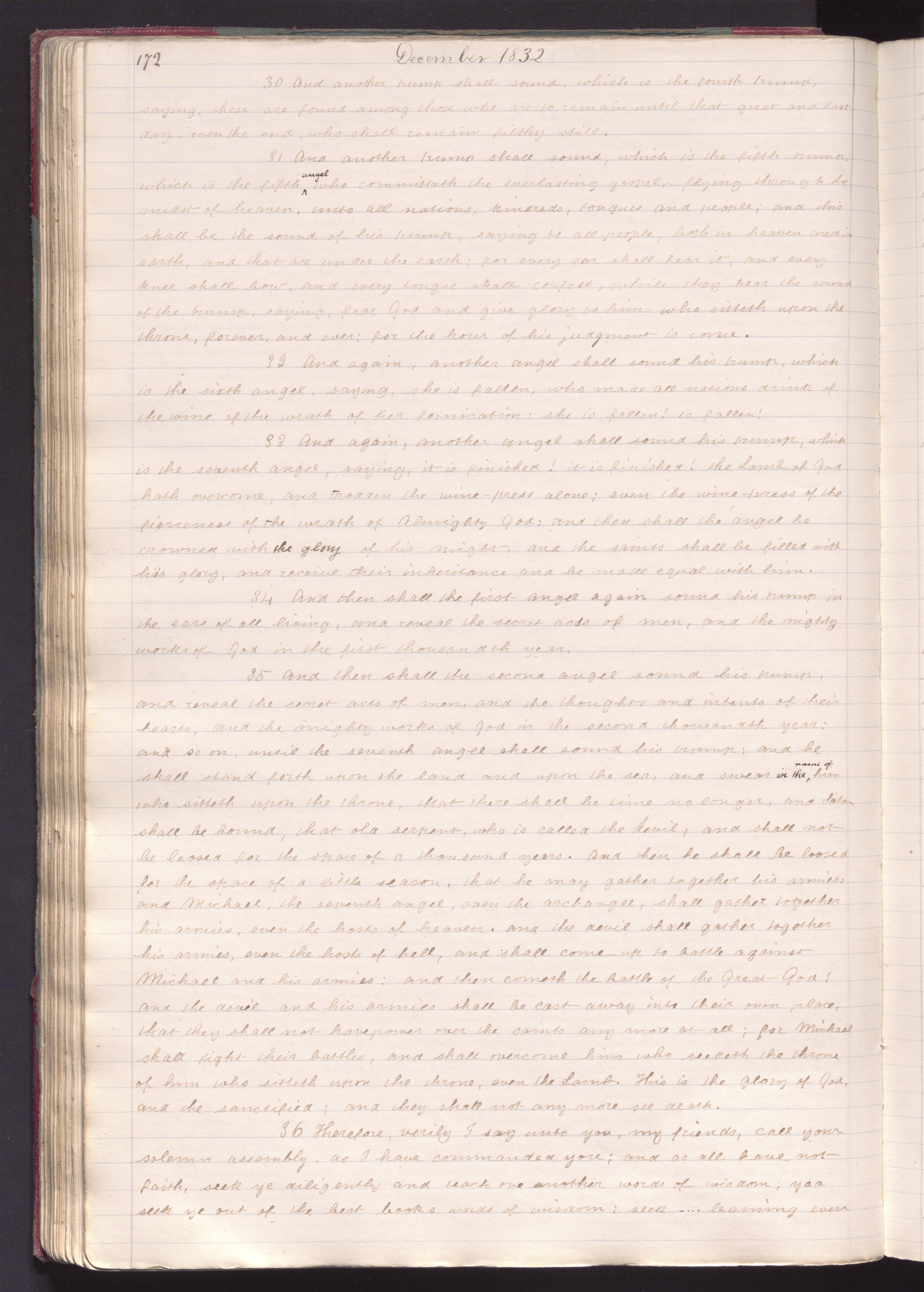 JS, History, 1838–1856, vol. A-2, created 4 Apr.–28 Nov. 1845 and 3–7 Aug. 1858; handwriting of , , , and ; 365 pages, plus seven pages of addenda; CHL. This is a copy of the first volume of a six-volume manuscript history of the church (JS History, 1838–1856, vol. A-1), and covers the period from 23 Dec. 1805 to 30 Aug. 1834. The copy also comprises four other volumes, labeled B-2, C-2, D-2, and E-2, and continues through 19 July 1843. The copy was discontinued 6 Aug. 1856 “by the advice of President ” (JS History, 1838–1856, vol. E-2, p. 83).