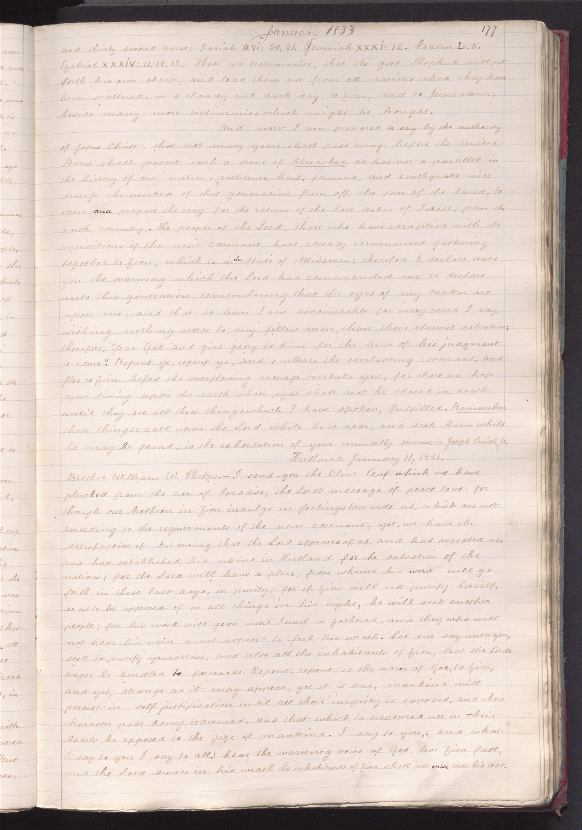 JS, History, 1838–1856, vol. A-2, created 4 Apr.–28 Nov. 1845 and 3–7 Aug. 1858; handwriting of , , , and ; 365 pages, plus seven pages of addenda; CHL. This is a copy of the first volume of a six-volume manuscript history of the church (JS History, 1838–1856, vol. A-1), and covers the period from 23 Dec. 1805 to 30 Aug. 1834. The copy also comprises four other volumes, labeled B-2, C-2, D-2, and E-2, and continues through 19 July 1843. The copy was discontinued 6 Aug. 1856 “by the advice of President ” (JS History, 1838–1856, vol. E-2, p. 83).