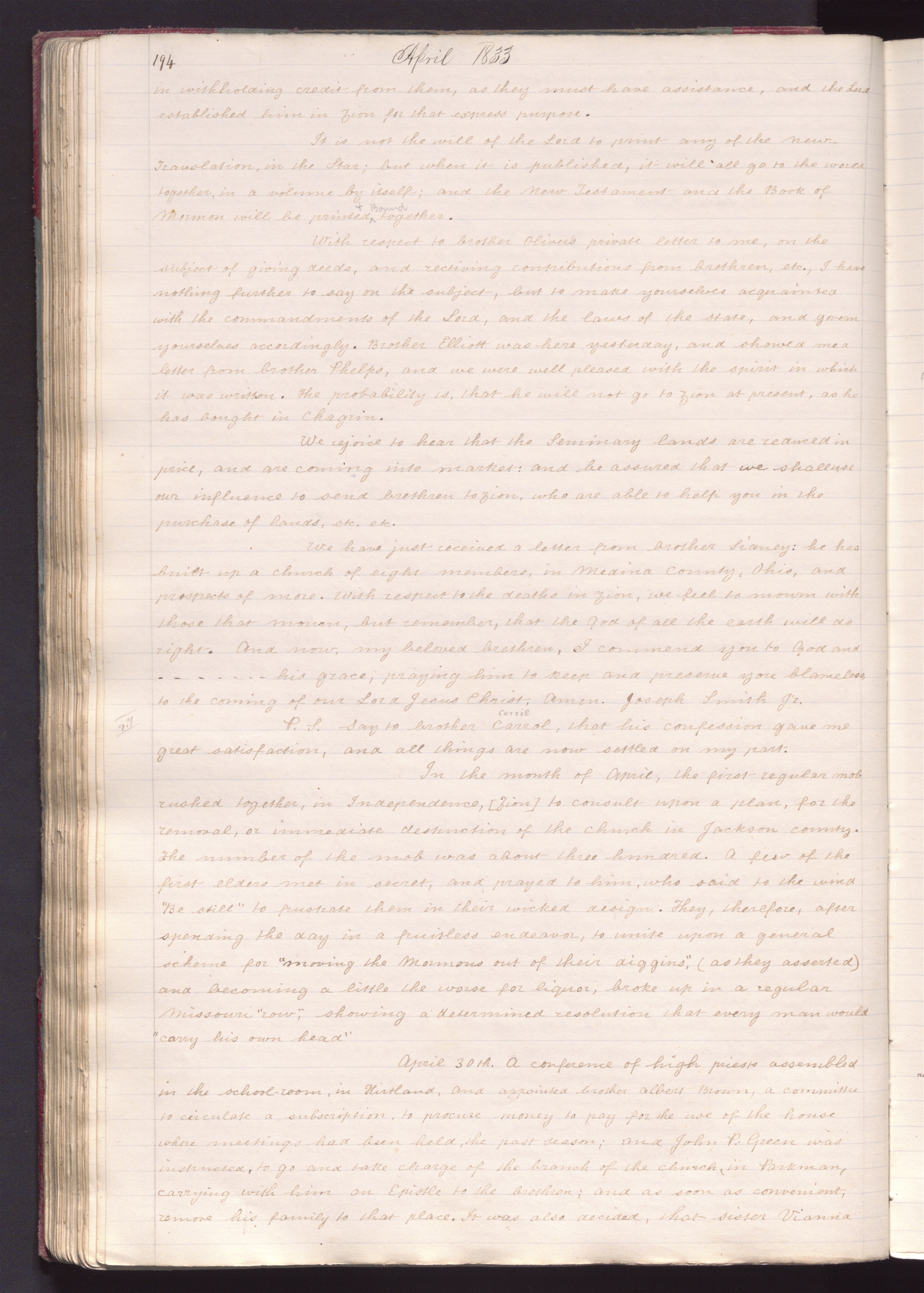 JS, History, 1838–1856, vol. A-2, created 4 Apr.–28 Nov. 1845 and 3–7 Aug. 1858; handwriting of , , , and ; 365 pages, plus seven pages of addenda; CHL. This is a copy of the first volume of a six-volume manuscript history of the church (JS History, 1838–1856, vol. A-1), and covers the period from 23 Dec. 1805 to 30 Aug. 1834. The copy also comprises four other volumes, labeled B-2, C-2, D-2, and E-2, and continues through 19 July 1843. The copy was discontinued 6 Aug. 1856 “by the advice of President ” (JS History, 1838–1856, vol. E-2, p. 83).