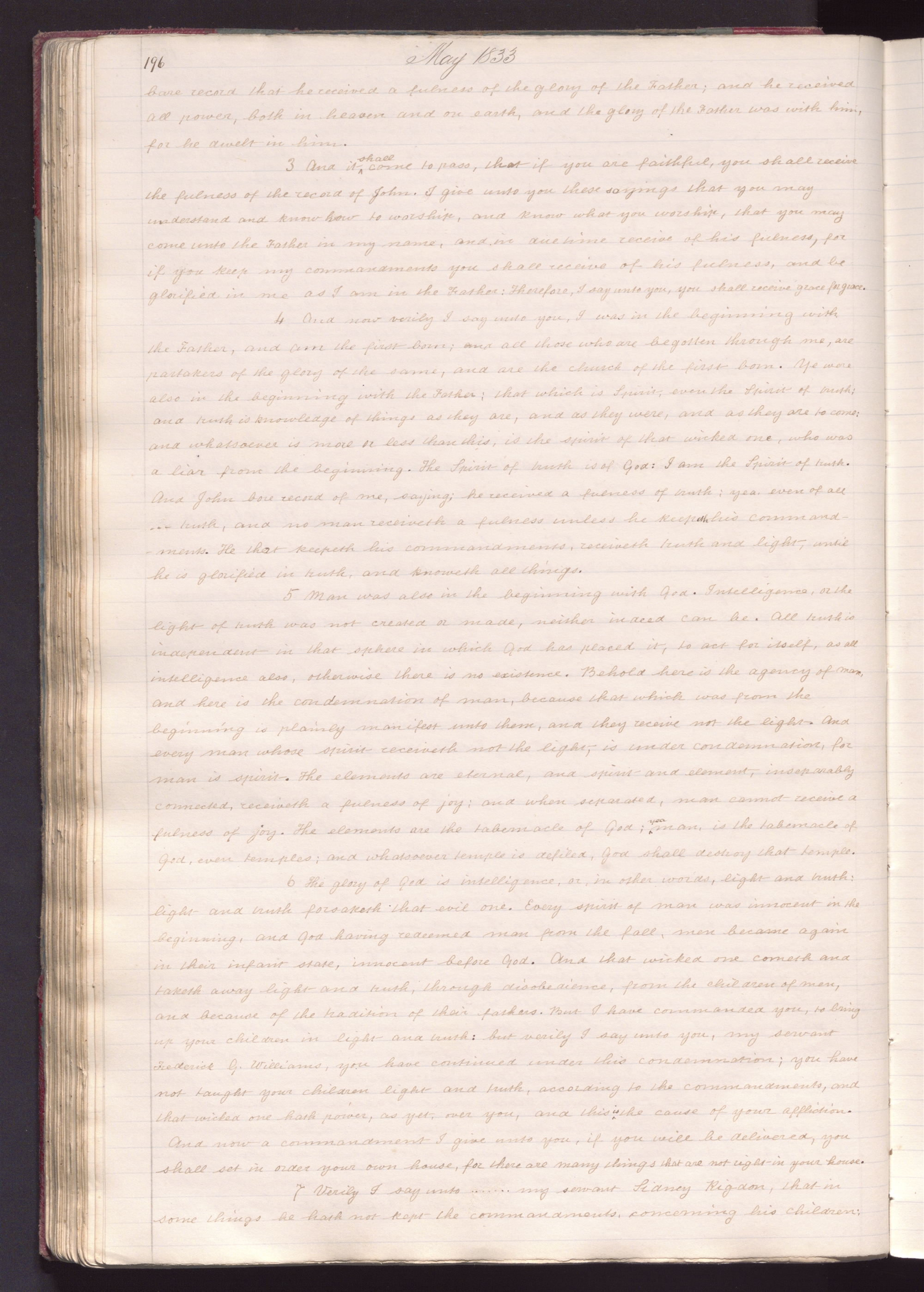 JS, History, 1838–1856, vol. A-2, created 4 Apr.–28 Nov. 1845 and 3–7 Aug. 1858; handwriting of , , , and ; 365 pages, plus seven pages of addenda; CHL. This is a copy of the first volume of a six-volume manuscript history of the church (JS History, 1838–1856, vol. A-1), and covers the period from 23 Dec. 1805 to 30 Aug. 1834. The copy also comprises four other volumes, labeled B-2, C-2, D-2, and E-2, and continues through 19 July 1843. The copy was discontinued 6 Aug. 1856 “by the advice of President ” (JS History, 1838–1856, vol. E-2, p. 83).