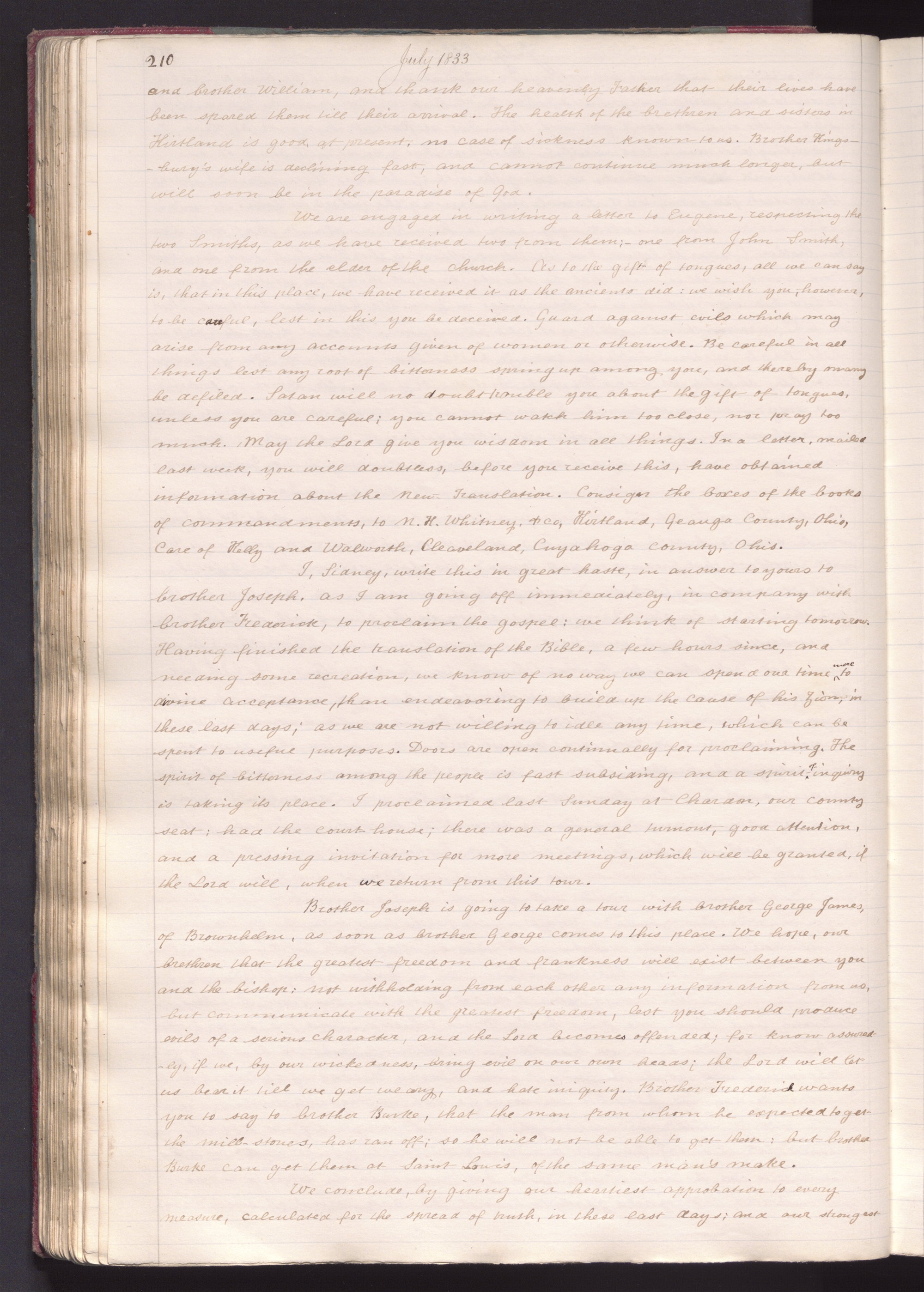 JS, History, 1838–1856, vol. A-2, created 4 Apr.–28 Nov. 1845 and 3–7 Aug. 1858; handwriting of , , , and ; 365 pages, plus seven pages of addenda; CHL. This is a copy of the first volume of a six-volume manuscript history of the church (JS History, 1838–1856, vol. A-1), and covers the period from 23 Dec. 1805 to 30 Aug. 1834. The copy also comprises four other volumes, labeled B-2, C-2, D-2, and E-2, and continues through 19 July 1843. The copy was discontinued 6 Aug. 1856 “by the advice of President ” (JS History, 1838–1856, vol. E-2, p. 83).