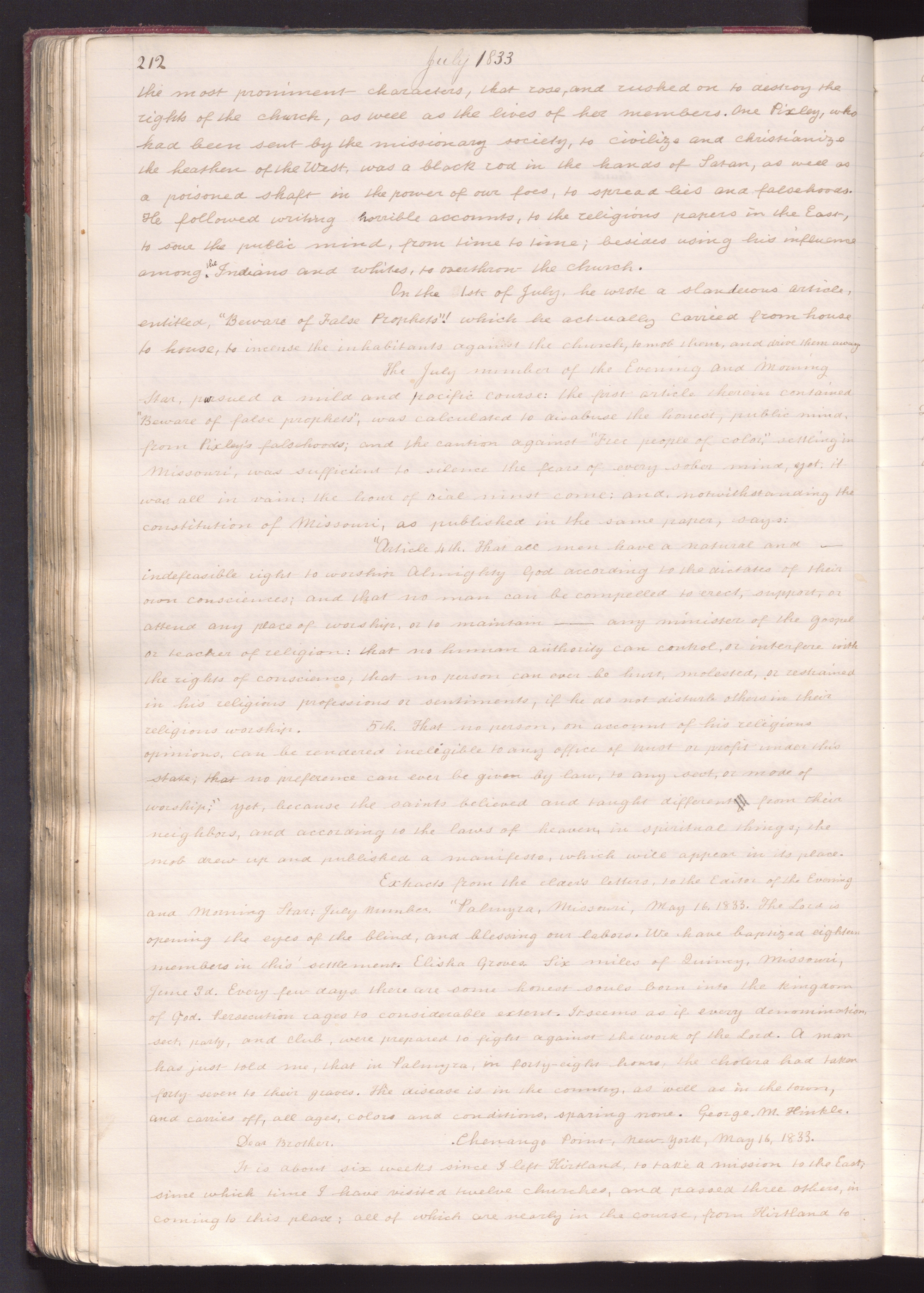 JS, History, 1838–1856, vol. A-2, created 4 Apr.–28 Nov. 1845 and 3–7 Aug. 1858; handwriting of , , , and ; 365 pages, plus seven pages of addenda; CHL. This is a copy of the first volume of a six-volume manuscript history of the church (JS History, 1838–1856, vol. A-1), and covers the period from 23 Dec. 1805 to 30 Aug. 1834. The copy also comprises four other volumes, labeled B-2, C-2, D-2, and E-2, and continues through 19 July 1843. The copy was discontinued 6 Aug. 1856 “by the advice of President ” (JS History, 1838–1856, vol. E-2, p. 83).