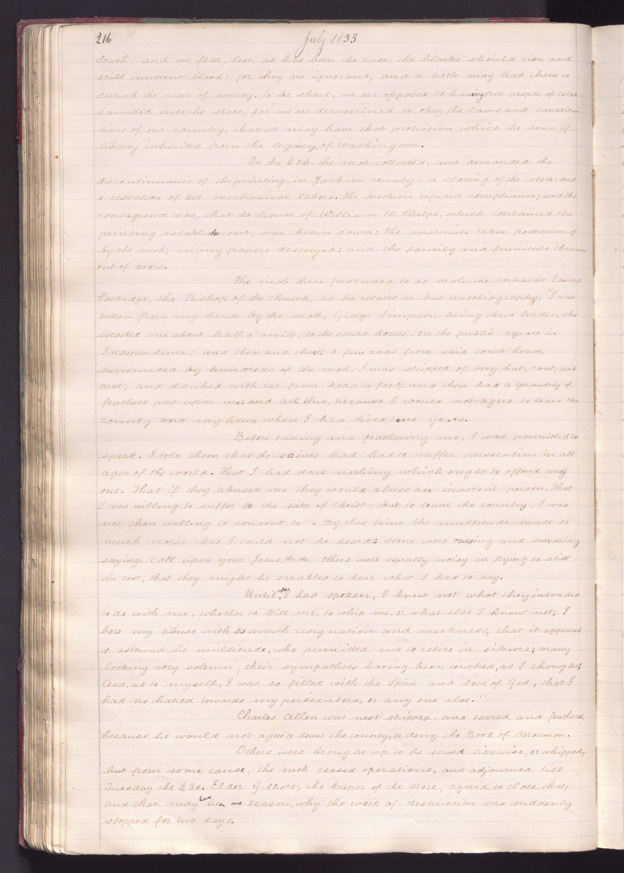 JS, History, 1838–1856, vol. A-2, created 4 Apr.–28 Nov. 1845 and 3–7 Aug. 1858; handwriting of , , , and ; 365 pages, plus seven pages of addenda; CHL. This is a copy of the first volume of a six-volume manuscript history of the church (JS History, 1838–1856, vol. A-1), and covers the period from 23 Dec. 1805 to 30 Aug. 1834. The copy also comprises four other volumes, labeled B-2, C-2, D-2, and E-2, and continues through 19 July 1843. The copy was discontinued 6 Aug. 1856 “by the advice of President ” (JS History, 1838–1856, vol. E-2, p. 83).