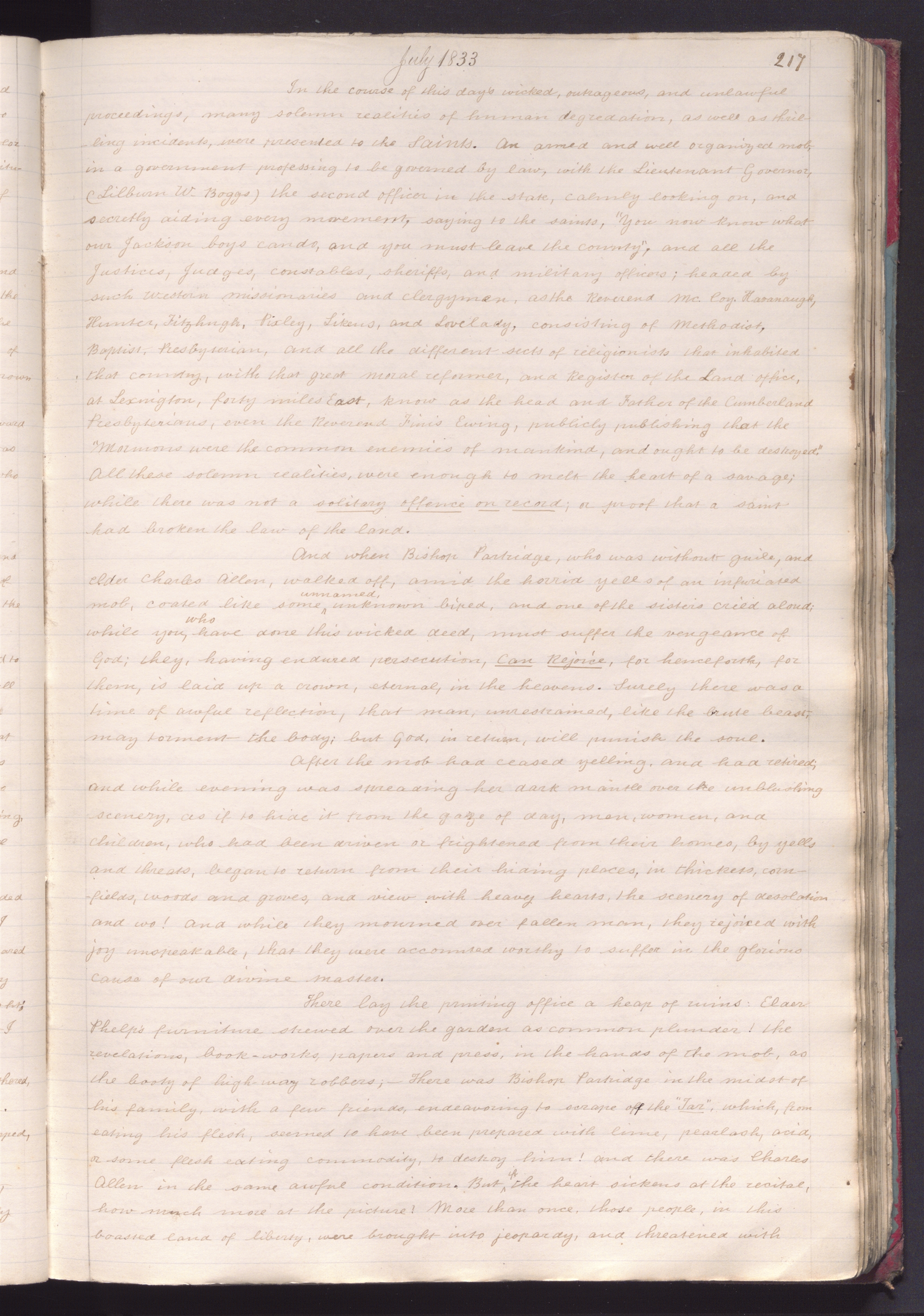 JS, History, 1838–1856, vol. A-2, created 4 Apr.–28 Nov. 1845 and 3–7 Aug. 1858; handwriting of , , , and ; 365 pages, plus seven pages of addenda; CHL. This is a copy of the first volume of a six-volume manuscript history of the church (JS History, 1838–1856, vol. A-1), and covers the period from 23 Dec. 1805 to 30 Aug. 1834. The copy also comprises four other volumes, labeled B-2, C-2, D-2, and E-2, and continues through 19 July 1843. The copy was discontinued 6 Aug. 1856 “by the advice of President ” (JS History, 1838–1856, vol. E-2, p. 83).
