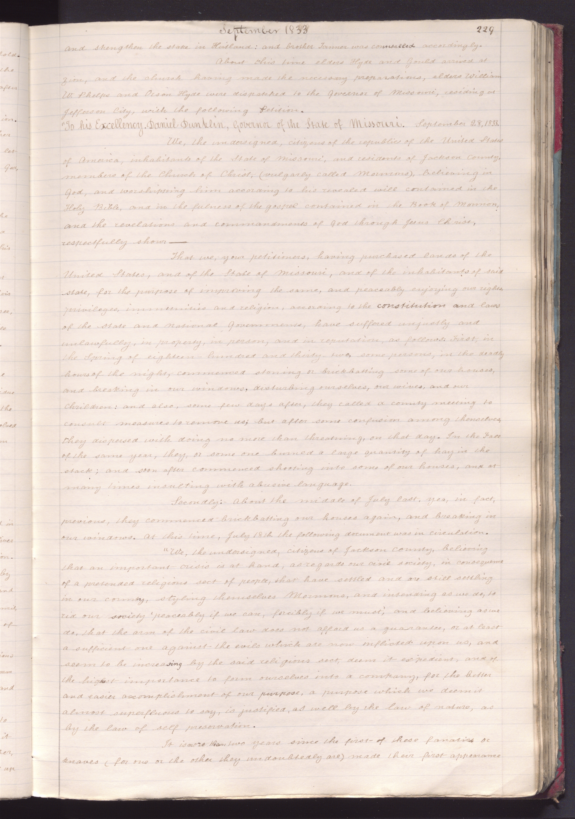 JS, History, 1838–1856, vol. A-2, created 4 Apr.–28 Nov. 1845 and 3–7 Aug. 1858; handwriting of , , , and ; 365 pages, plus seven pages of addenda; CHL. This is a copy of the first volume of a six-volume manuscript history of the church (JS History, 1838–1856, vol. A-1), and covers the period from 23 Dec. 1805 to 30 Aug. 1834. The copy also comprises four other volumes, labeled B-2, C-2, D-2, and E-2, and continues through 19 July 1843. The copy was discontinued 6 Aug. 1856 “by the advice of President ” (JS History, 1838–1856, vol. E-2, p. 83).