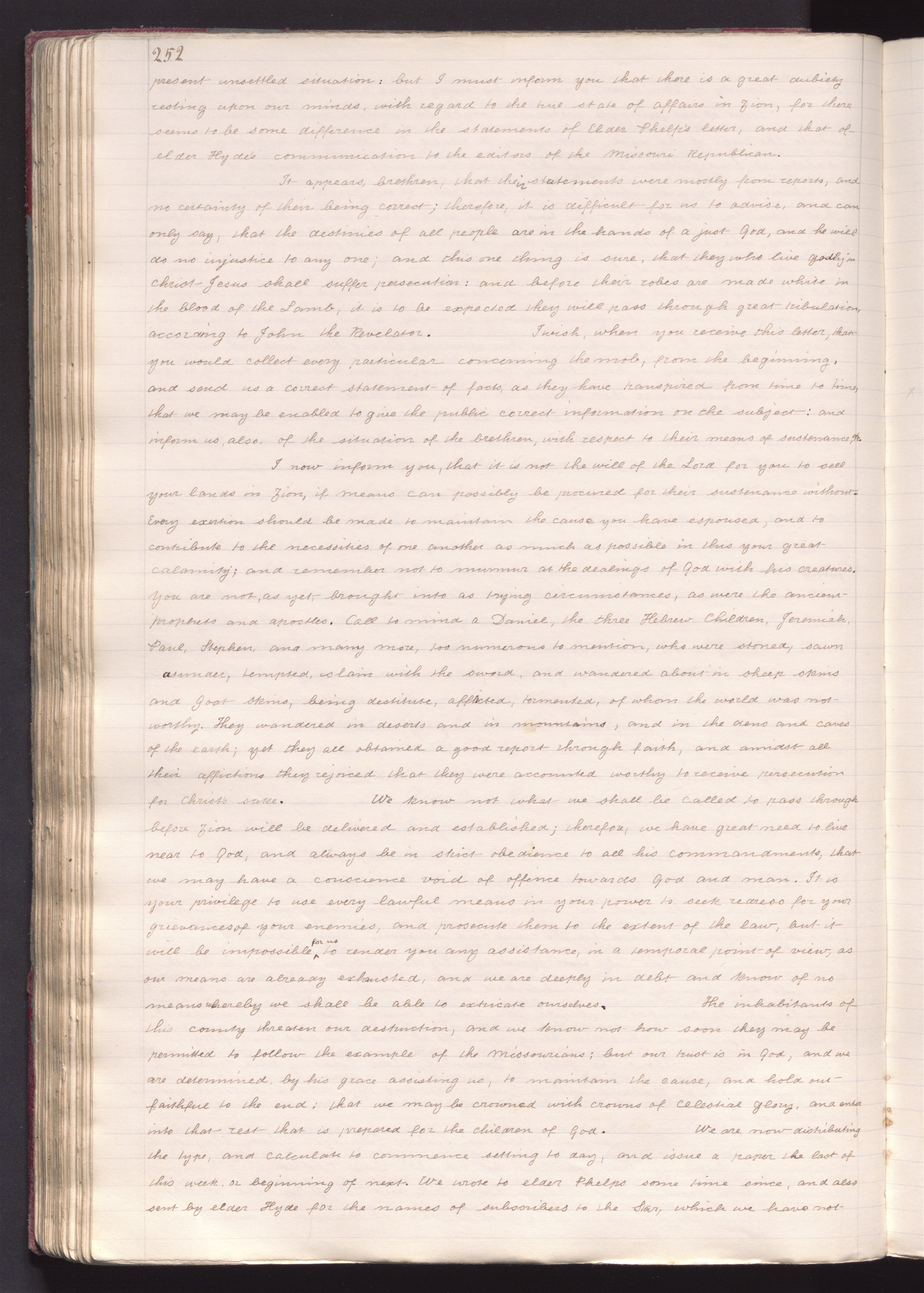 JS, History, 1838–1856, vol. A-2, created 4 Apr.–28 Nov. 1845 and 3–7 Aug. 1858; handwriting of , , , and ; 365 pages, plus seven pages of addenda; CHL. This is a copy of the first volume of a six-volume manuscript history of the church (JS History, 1838–1856, vol. A-1), and covers the period from 23 Dec. 1805 to 30 Aug. 1834. The copy also comprises four other volumes, labeled B-2, C-2, D-2, and E-2, and continues through 19 July 1843. The copy was discontinued 6 Aug. 1856 “by the advice of President ” (JS History, 1838–1856, vol. E-2, p. 83).