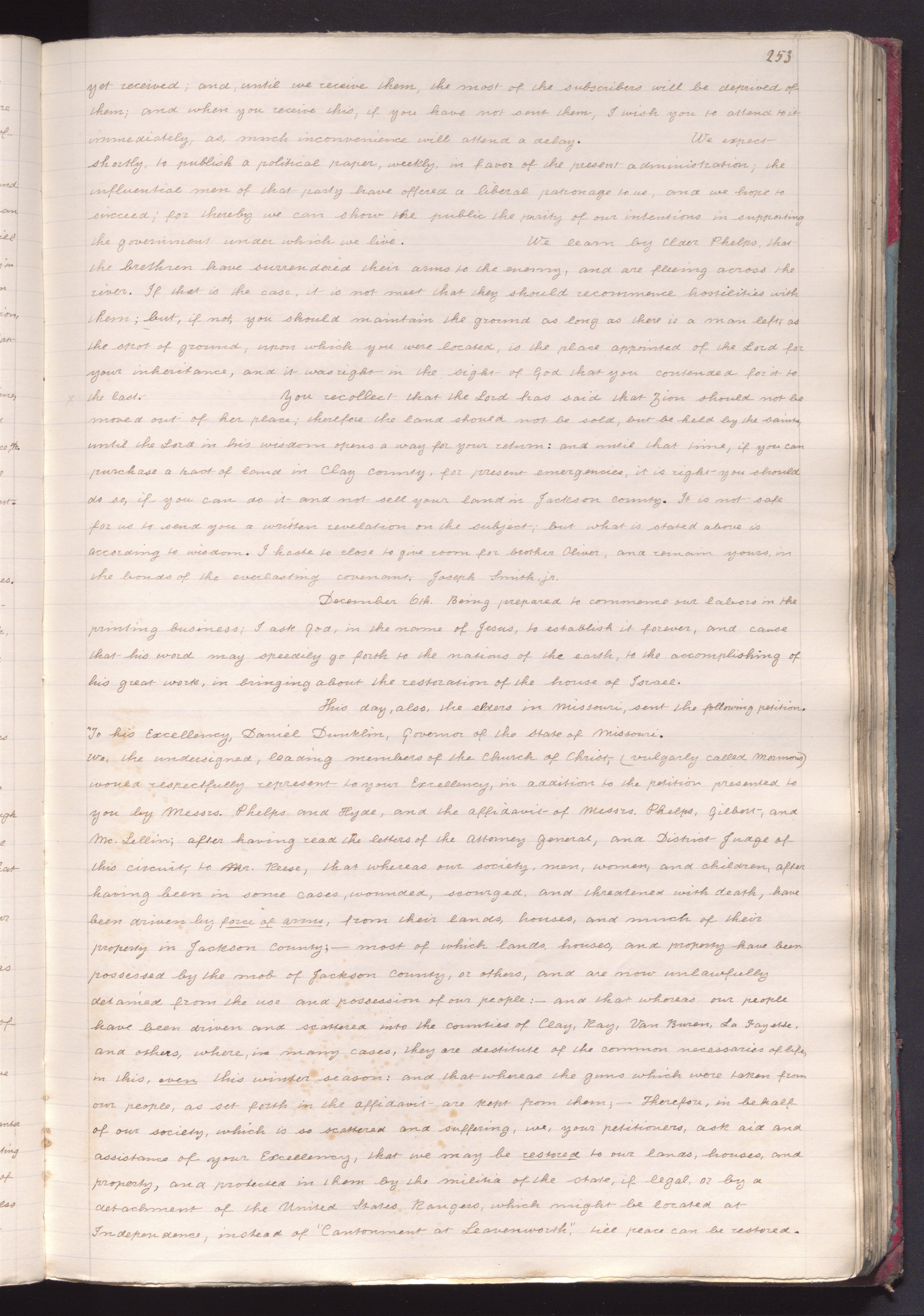 JS, History, 1838–1856, vol. A-2, created 4 Apr.–28 Nov. 1845 and 3–7 Aug. 1858; handwriting of , , , and ; 365 pages, plus seven pages of addenda; CHL. This is a copy of the first volume of a six-volume manuscript history of the church (JS History, 1838–1856, vol. A-1), and covers the period from 23 Dec. 1805 to 30 Aug. 1834. The copy also comprises four other volumes, labeled B-2, C-2, D-2, and E-2, and continues through 19 July 1843. The copy was discontinued 6 Aug. 1856 “by the advice of President ” (JS History, 1838–1856, vol. E-2, p. 83).