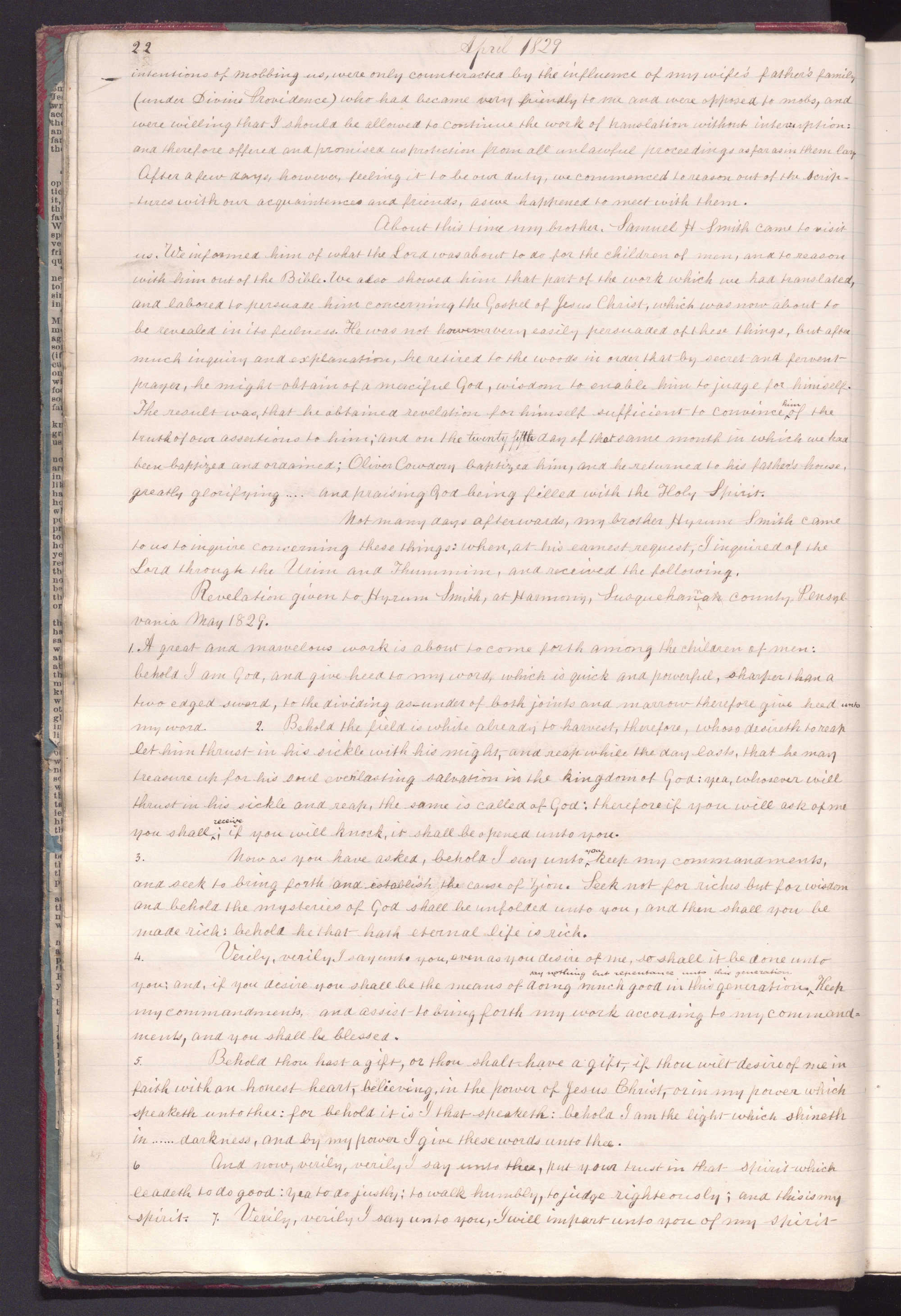 JS, History, 1838–1856, vol. A-2, created 4 Apr.–28 Nov. 1845 and 3–7 Aug. 1858; handwriting of , , , and ; 365 pages, plus seven pages of addenda; CHL. This is a copy of the first volume of a six-volume manuscript history of the church (JS History, 1838–1856, vol. A-1), and covers the period from 23 Dec. 1805 to 30 Aug. 1834. The copy also comprises four other volumes, labeled B-2, C-2, D-2, and E-2, and continues through 19 July 1843. The copy was discontinued 6 Aug. 1856 “by the advice of President ” (JS History, 1838–1856, vol. E-2, p. 83).