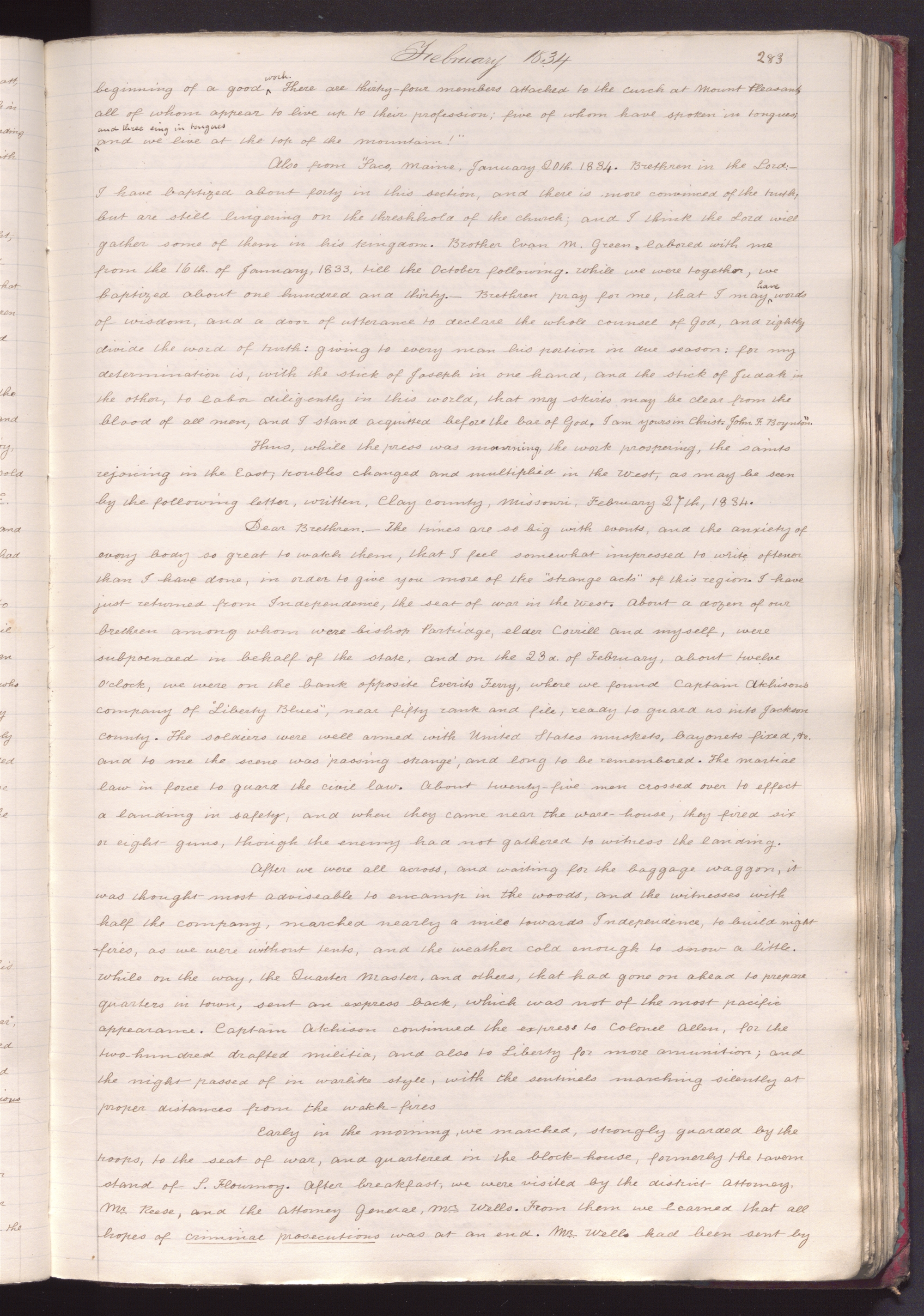 JS, History, 1838–1856, vol. A-2, created 4 Apr.–28 Nov. 1845 and 3–7 Aug. 1858; handwriting of , , , and ; 365 pages, plus seven pages of addenda; CHL. This is a copy of the first volume of a six-volume manuscript history of the church (JS History, 1838–1856, vol. A-1), and covers the period from 23 Dec. 1805 to 30 Aug. 1834. The copy also comprises four other volumes, labeled B-2, C-2, D-2, and E-2, and continues through 19 July 1843. The copy was discontinued 6 Aug. 1856 “by the advice of President ” (JS History, 1838–1856, vol. E-2, p. 83).