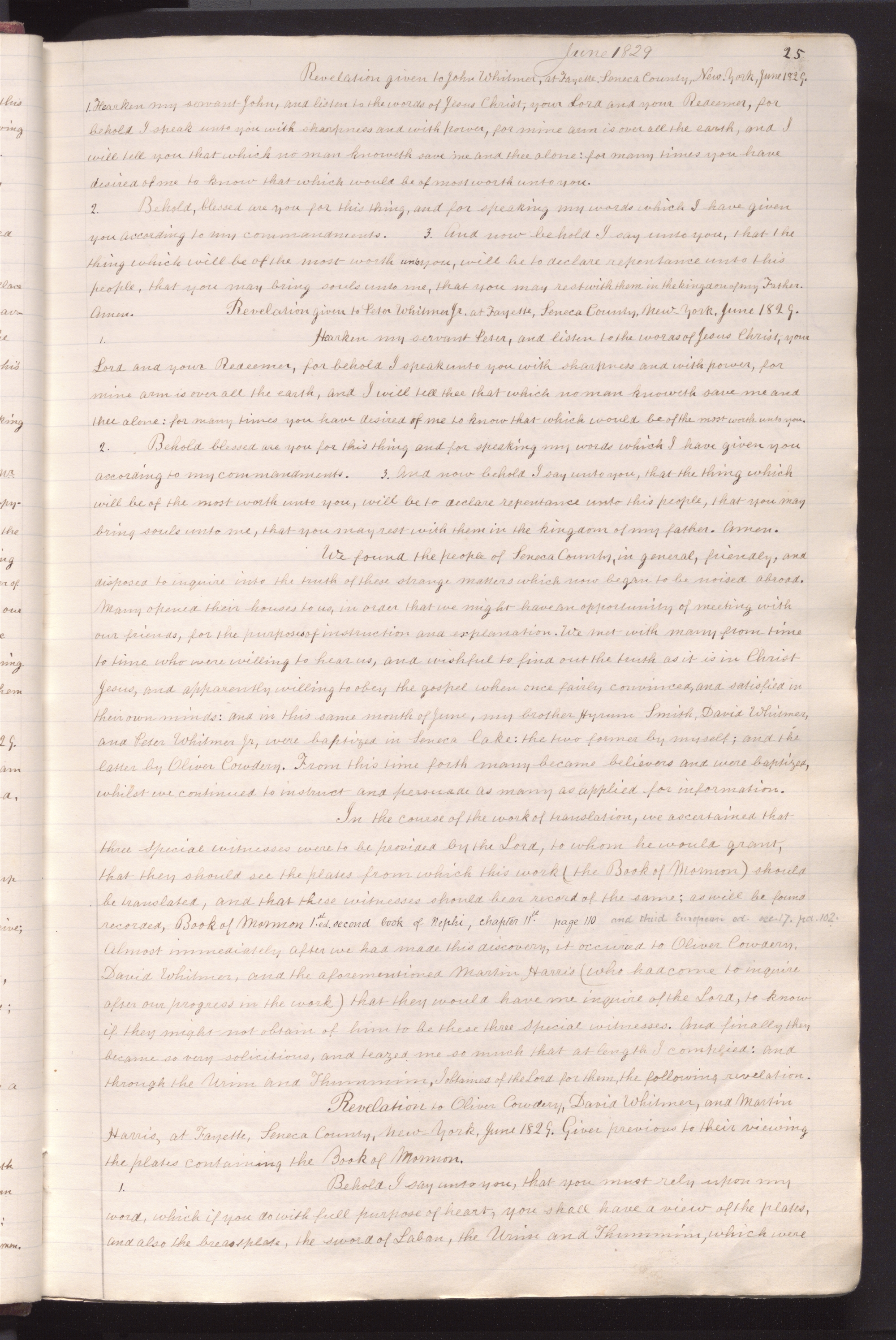 JS, History, 1838–1856, vol. A-2, created 4 Apr.–28 Nov. 1845 and 3–7 Aug. 1858; handwriting of , , , and ; 365 pages, plus seven pages of addenda; CHL. This is a copy of the first volume of a six-volume manuscript history of the church (JS History, 1838–1856, vol. A-1), and covers the period from 23 Dec. 1805 to 30 Aug. 1834. The copy also comprises four other volumes, labeled B-2, C-2, D-2, and E-2, and continues through 19 July 1843. The copy was discontinued 6 Aug. 1856 “by the advice of President ” (JS History, 1838–1856, vol. E-2, p. 83).