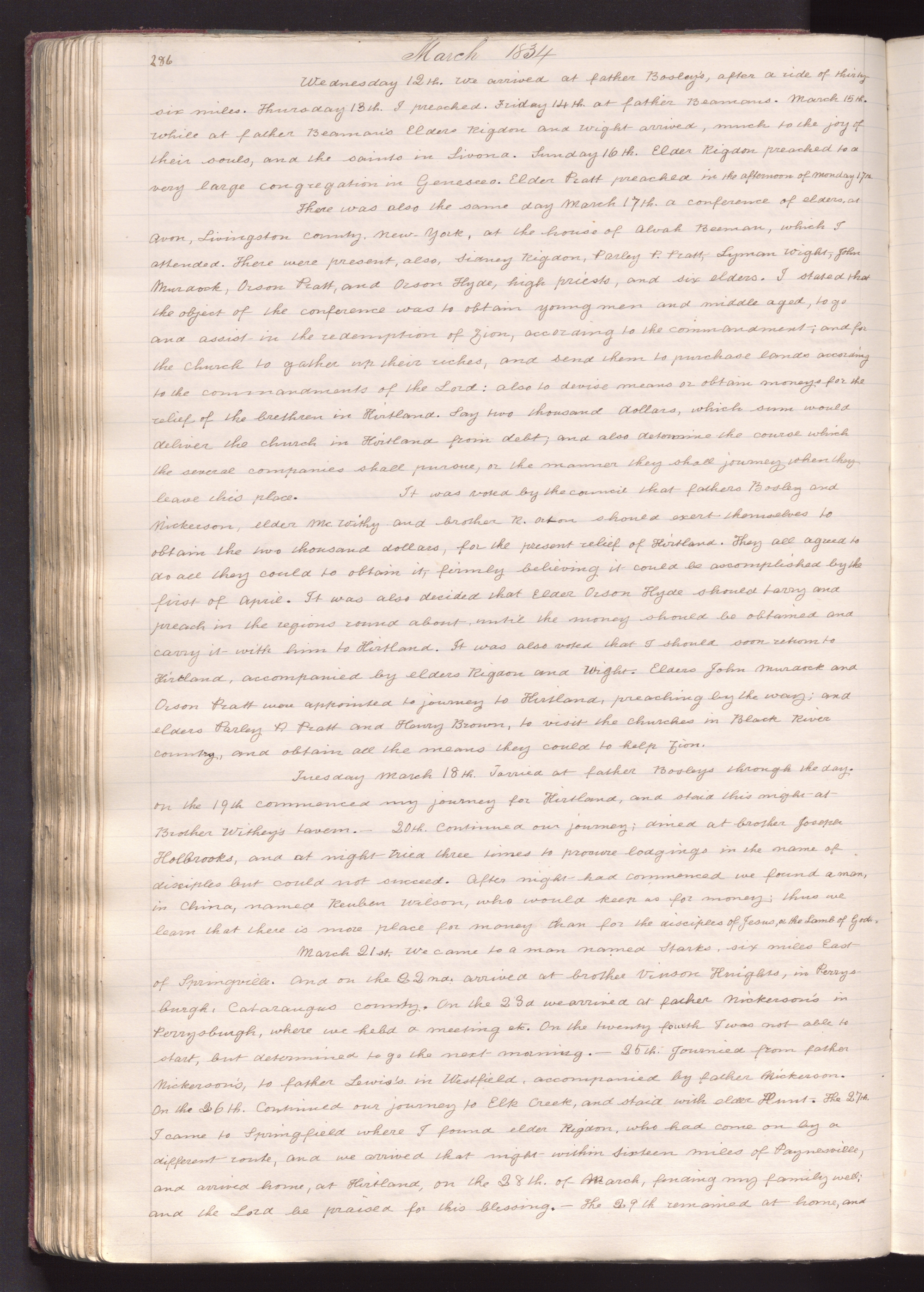 JS, History, 1838–1856, vol. A-2, created 4 Apr.–28 Nov. 1845 and 3–7 Aug. 1858; handwriting of , , , and ; 365 pages, plus seven pages of addenda; CHL. This is a copy of the first volume of a six-volume manuscript history of the church (JS History, 1838–1856, vol. A-1), and covers the period from 23 Dec. 1805 to 30 Aug. 1834. The copy also comprises four other volumes, labeled B-2, C-2, D-2, and E-2, and continues through 19 July 1843. The copy was discontinued 6 Aug. 1856 “by the advice of President ” (JS History, 1838–1856, vol. E-2, p. 83).