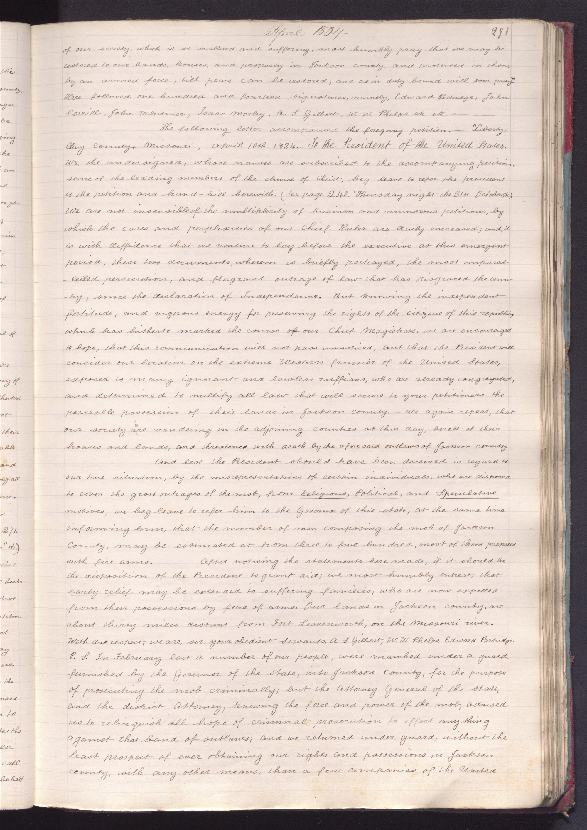 JS, History, 1838–1856, vol. A-2, created 4 Apr.–28 Nov. 1845 and 3–7 Aug. 1858; handwriting of , , , and ; 365 pages, plus seven pages of addenda; CHL. This is a copy of the first volume of a six-volume manuscript history of the church (JS History, 1838–1856, vol. A-1), and covers the period from 23 Dec. 1805 to 30 Aug. 1834. The copy also comprises four other volumes, labeled B-2, C-2, D-2, and E-2, and continues through 19 July 1843. The copy was discontinued 6 Aug. 1856 “by the advice of President ” (JS History, 1838–1856, vol. E-2, p. 83).