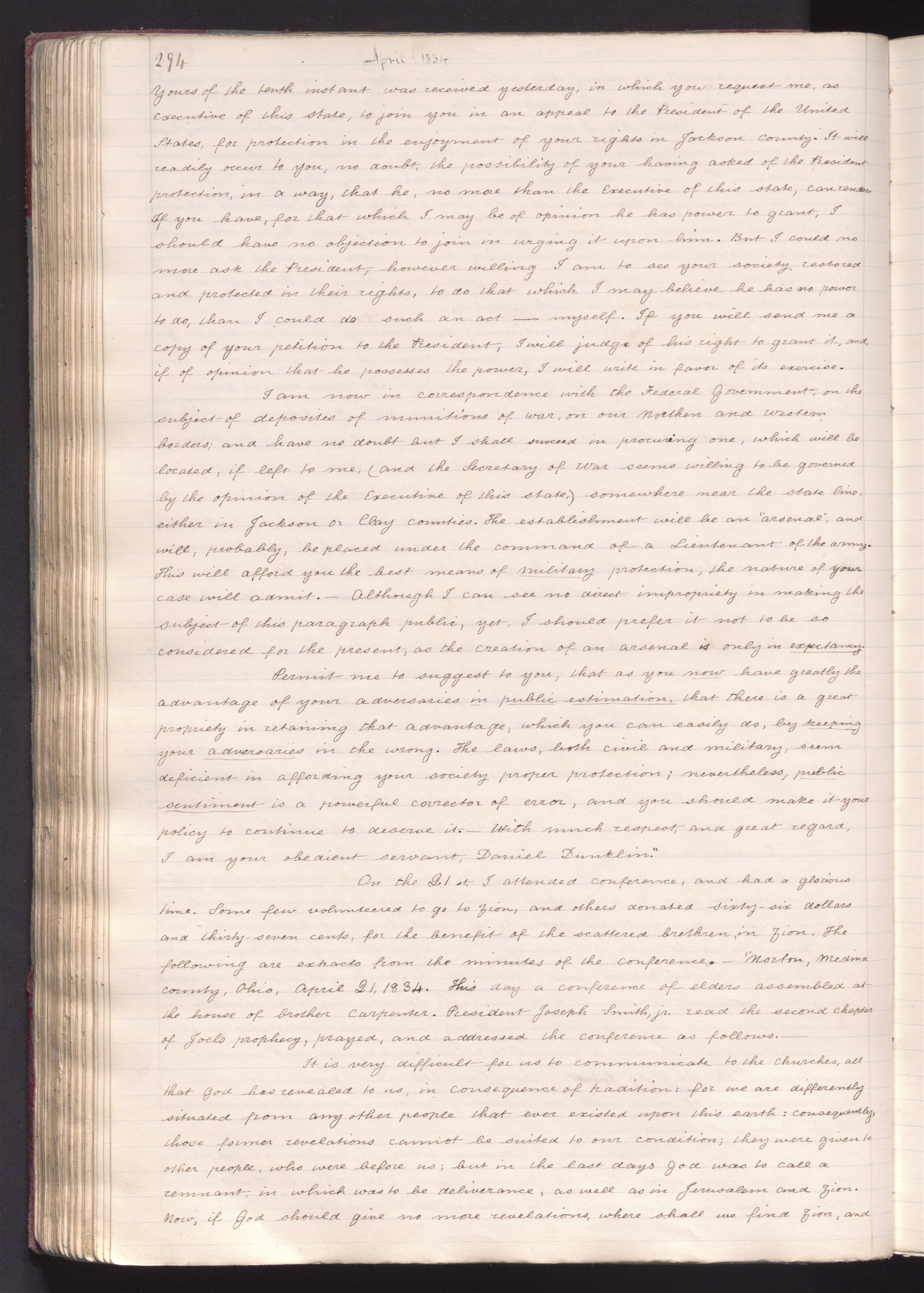 JS, History, 1838–1856, vol. A-2, created 4 Apr.–28 Nov. 1845 and 3–7 Aug. 1858; handwriting of , , , and ; 365 pages, plus seven pages of addenda; CHL. This is a copy of the first volume of a six-volume manuscript history of the church (JS History, 1838–1856, vol. A-1), and covers the period from 23 Dec. 1805 to 30 Aug. 1834. The copy also comprises four other volumes, labeled B-2, C-2, D-2, and E-2, and continues through 19 July 1843. The copy was discontinued 6 Aug. 1856 “by the advice of President ” (JS History, 1838–1856, vol. E-2, p. 83).