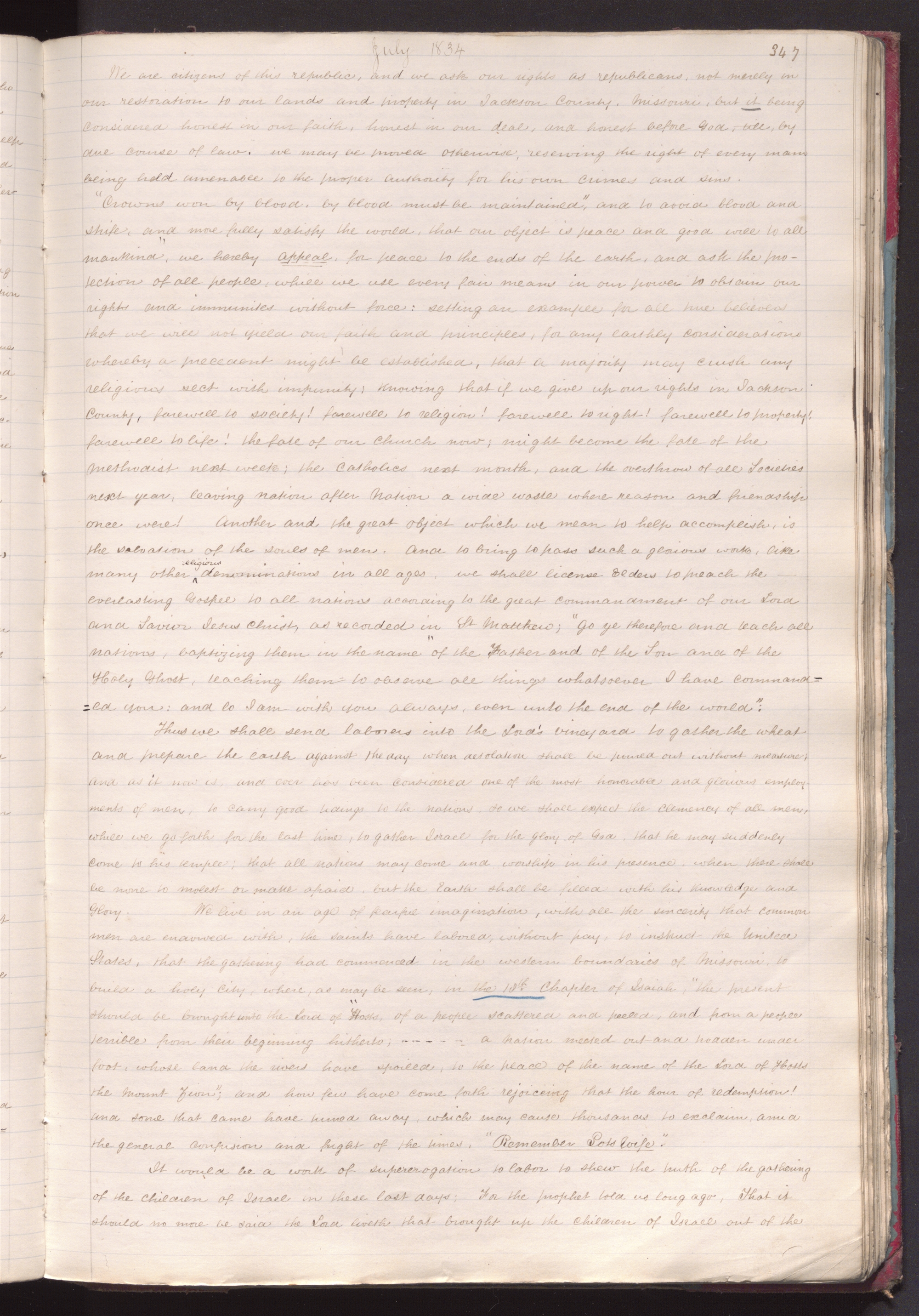 JS, History, 1838–1856, vol. A-2, created 4 Apr.–28 Nov. 1845 and 3–7 Aug. 1858; handwriting of , , , and ; 365 pages, plus seven pages of addenda; CHL. This is a copy of the first volume of a six-volume manuscript history of the church (JS History, 1838–1856, vol. A-1), and covers the period from 23 Dec. 1805 to 30 Aug. 1834. The copy also comprises four other volumes, labeled B-2, C-2, D-2, and E-2, and continues through 19 July 1843. The copy was discontinued 6 Aug. 1856 “by the advice of President ” (JS History, 1838–1856, vol. E-2, p. 83).