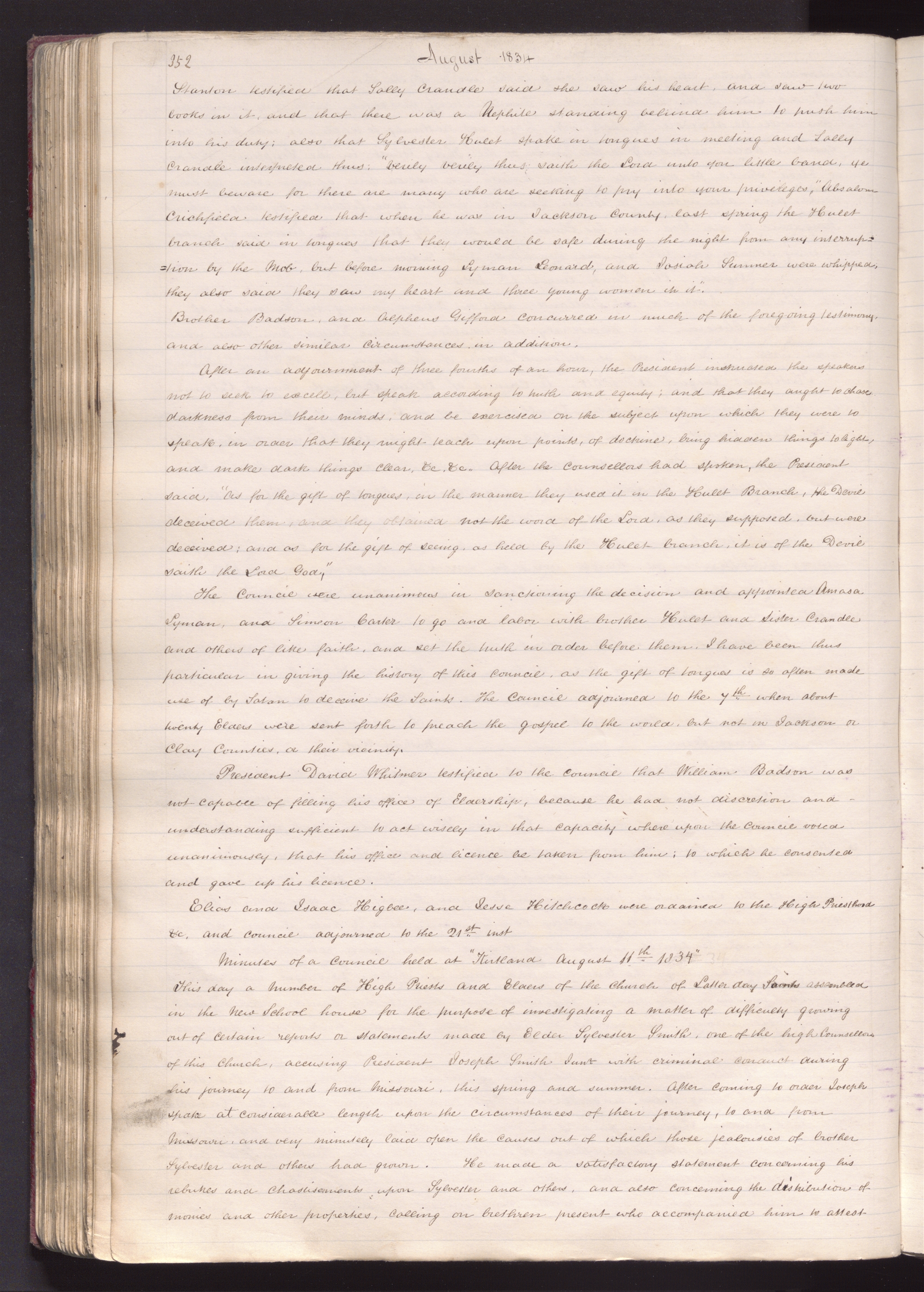 JS, History, 1838–1856, vol. A-2, created 4 Apr.–28 Nov. 1845 and 3–7 Aug. 1858; handwriting of , , , and ; 365 pages, plus seven pages of addenda; CHL. This is a copy of the first volume of a six-volume manuscript history of the church (JS History, 1838–1856, vol. A-1), and covers the period from 23 Dec. 1805 to 30 Aug. 1834. The copy also comprises four other volumes, labeled B-2, C-2, D-2, and E-2, and continues through 19 July 1843. The copy was discontinued 6 Aug. 1856 “by the advice of President ” (JS History, 1838–1856, vol. E-2, p. 83).