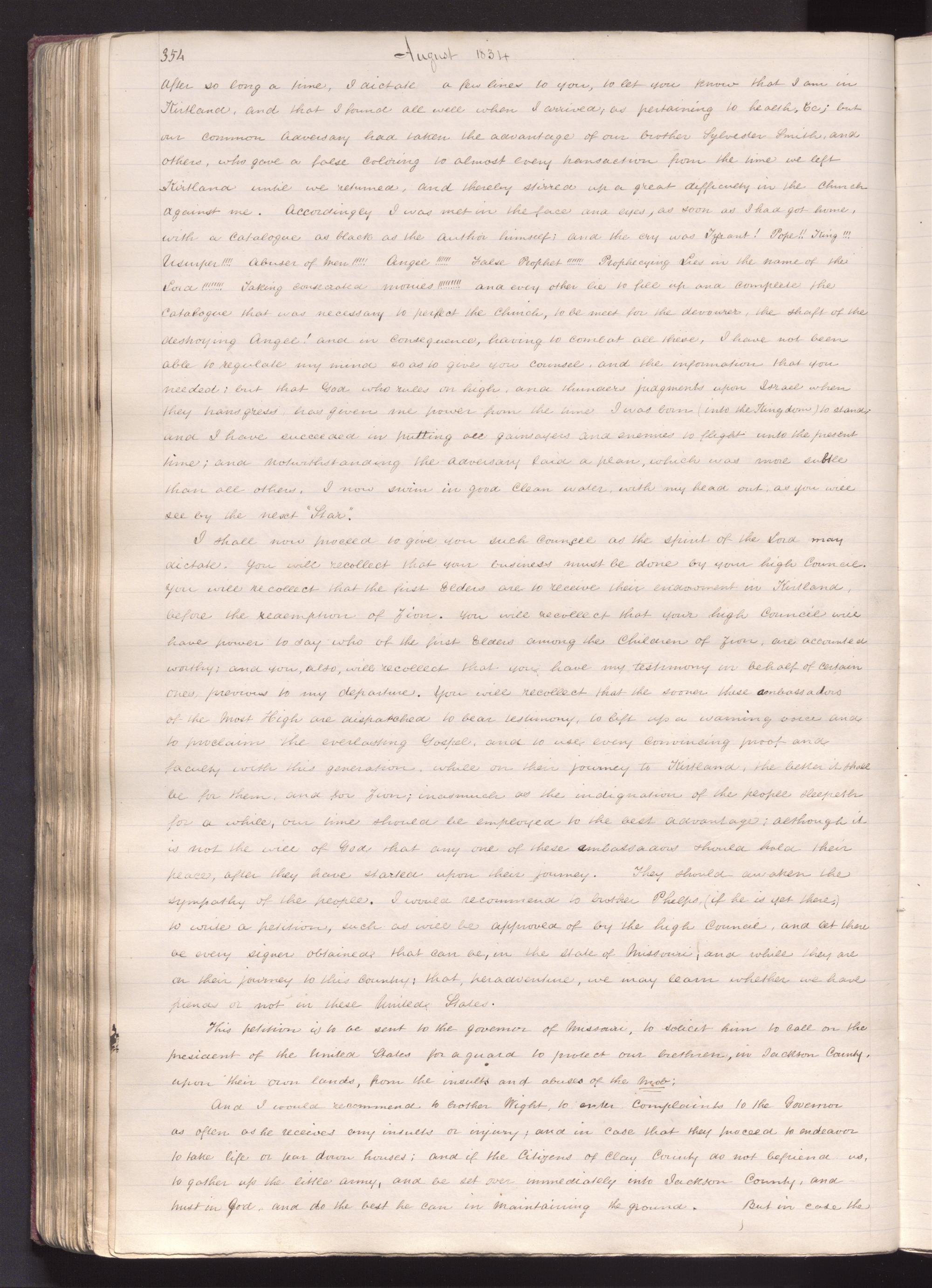 JS, History, 1838–1856, vol. A-2, created 4 Apr.–28 Nov. 1845 and 3–7 Aug. 1858; handwriting of , , , and ; 365 pages, plus seven pages of addenda; CHL. This is a copy of the first volume of a six-volume manuscript history of the church (JS History, 1838–1856, vol. A-1), and covers the period from 23 Dec. 1805 to 30 Aug. 1834. The copy also comprises four other volumes, labeled B-2, C-2, D-2, and E-2, and continues through 19 July 1843. The copy was discontinued 6 Aug. 1856 “by the advice of President ” (JS History, 1838–1856, vol. E-2, p. 83).