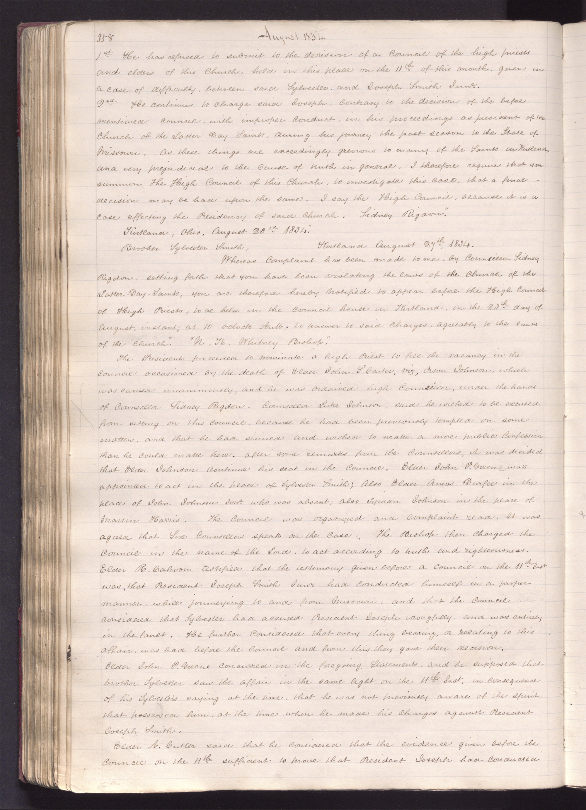 JS, History, 1838–1856, vol. A-2, created 4 Apr.–28 Nov. 1845 and 3–7 Aug. 1858; handwriting of , , , and ; 365 pages, plus seven pages of addenda; CHL. This is a copy of the first volume of a six-volume manuscript history of the church (JS History, 1838–1856, vol. A-1), and covers the period from 23 Dec. 1805 to 30 Aug. 1834. The copy also comprises four other volumes, labeled B-2, C-2, D-2, and E-2, and continues through 19 July 1843. The copy was discontinued 6 Aug. 1856 “by the advice of President ” (JS History, 1838–1856, vol. E-2, p. 83).