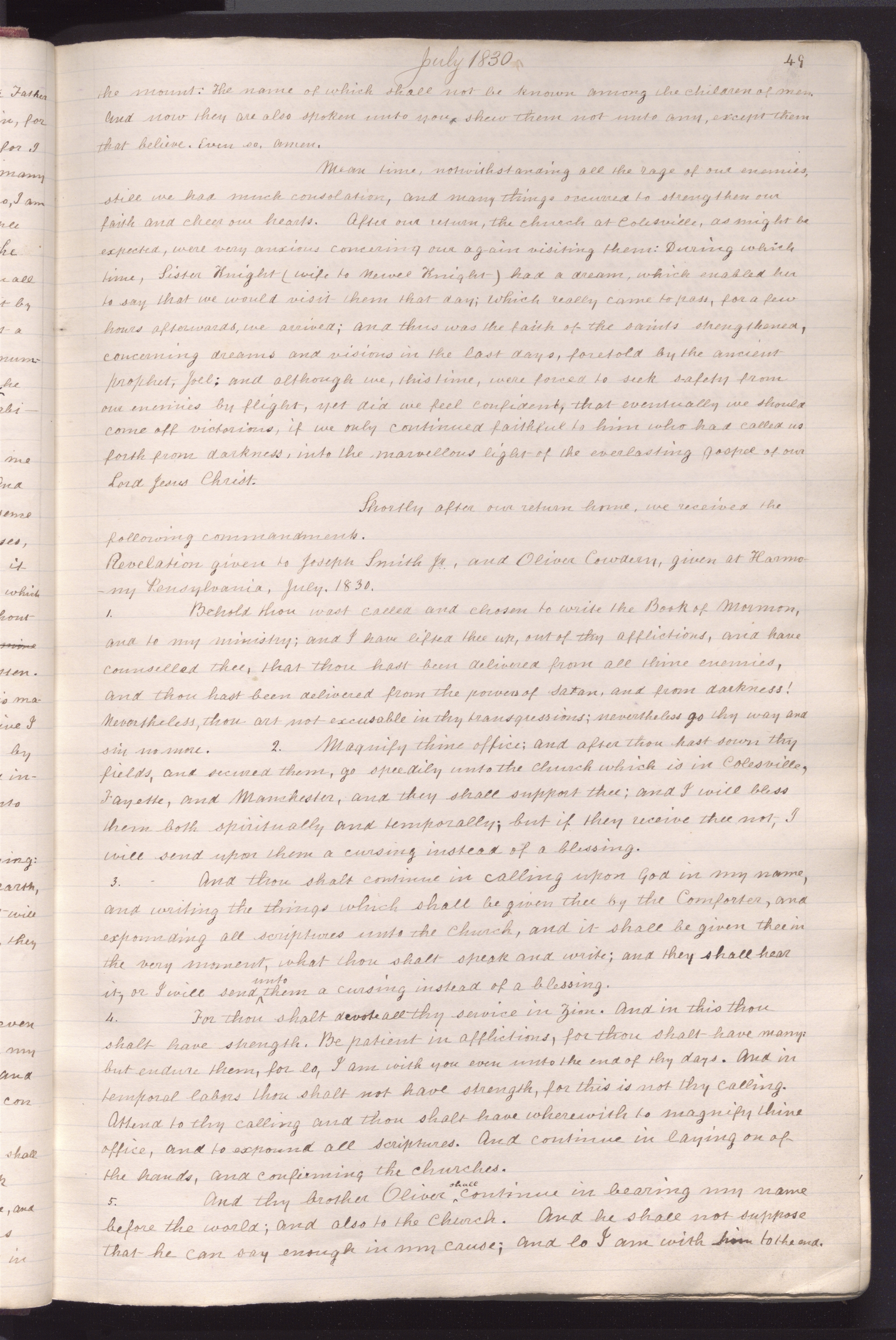 JS, History, 1838–1856, vol. A-2, created 4 Apr.–28 Nov. 1845 and 3–7 Aug. 1858; handwriting of , , , and ; 365 pages, plus seven pages of addenda; CHL. This is a copy of the first volume of a six-volume manuscript history of the church (JS History, 1838–1856, vol. A-1), and covers the period from 23 Dec. 1805 to 30 Aug. 1834. The copy also comprises four other volumes, labeled B-2, C-2, D-2, and E-2, and continues through 19 July 1843. The copy was discontinued 6 Aug. 1856 “by the advice of President ” (JS History, 1838–1856, vol. E-2, p. 83).