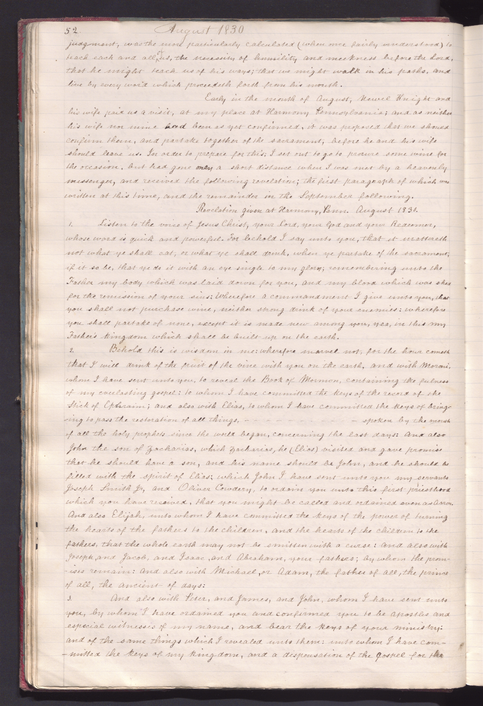 JS, History, 1838–1856, vol. A-2, created 4 Apr.–28 Nov. 1845 and 3–7 Aug. 1858; handwriting of , , , and ; 365 pages, plus seven pages of addenda; CHL. This is a copy of the first volume of a six-volume manuscript history of the church (JS History, 1838–1856, vol. A-1), and covers the period from 23 Dec. 1805 to 30 Aug. 1834. The copy also comprises four other volumes, labeled B-2, C-2, D-2, and E-2, and continues through 19 July 1843. The copy was discontinued 6 Aug. 1856 “by the advice of President ” (JS History, 1838–1856, vol. E-2, p. 83).