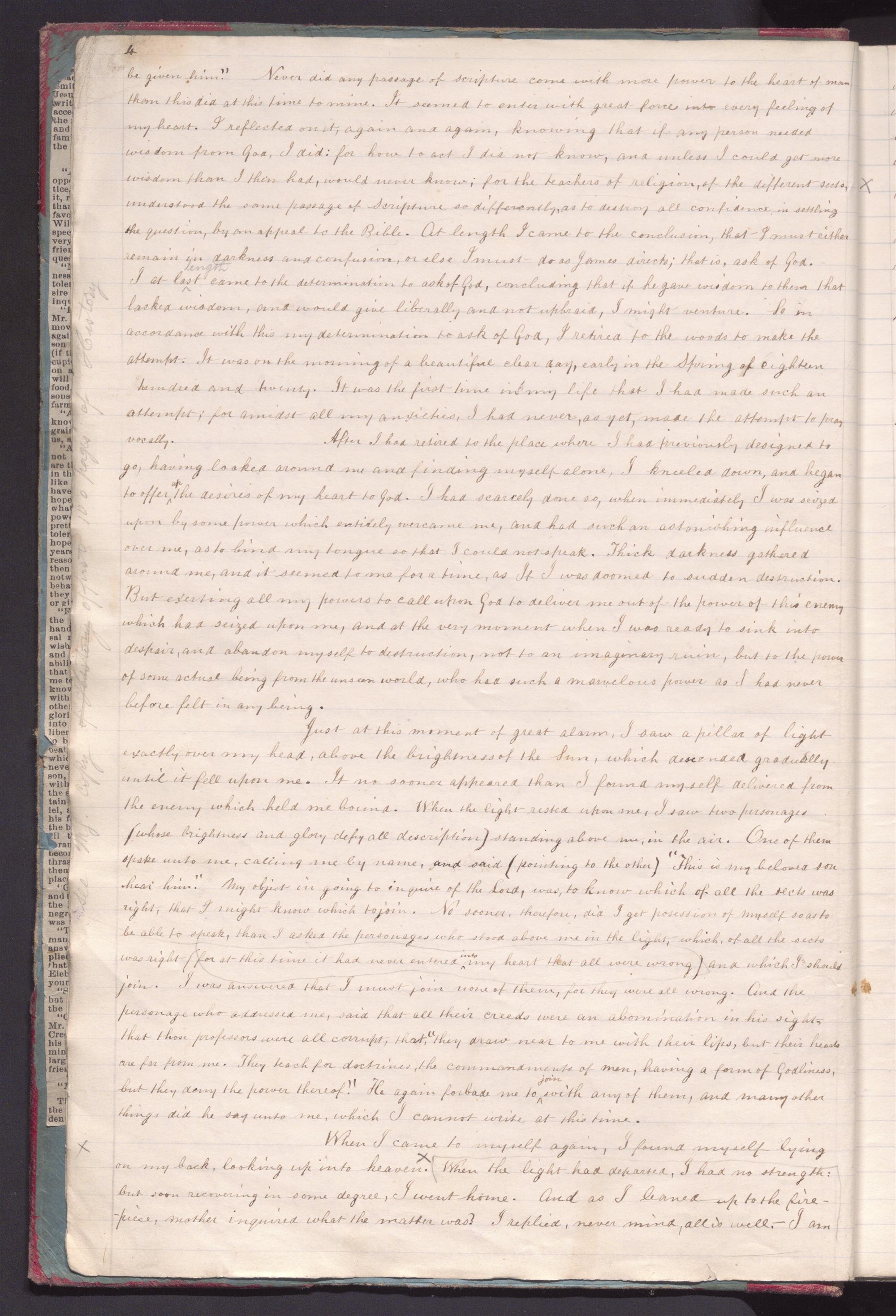 JS, History, 1838–1856, vol. A-2, created 4 Apr.–28 Nov. 1845 and 3–7 Aug. 1858; handwriting of , , , and ; 365 pages, plus seven pages of addenda; CHL. This is a copy of the first volume of a six-volume manuscript history of the church (JS History, 1838–1856, vol. A-1), and covers the period from 23 Dec. 1805 to 30 Aug. 1834. The copy also comprises four other volumes, labeled B-2, C-2, D-2, and E-2, and continues through 19 July 1843. The copy was discontinued 6 Aug. 1856 “by the advice of President ” (JS History, 1838–1856, vol. E-2, p. 83).