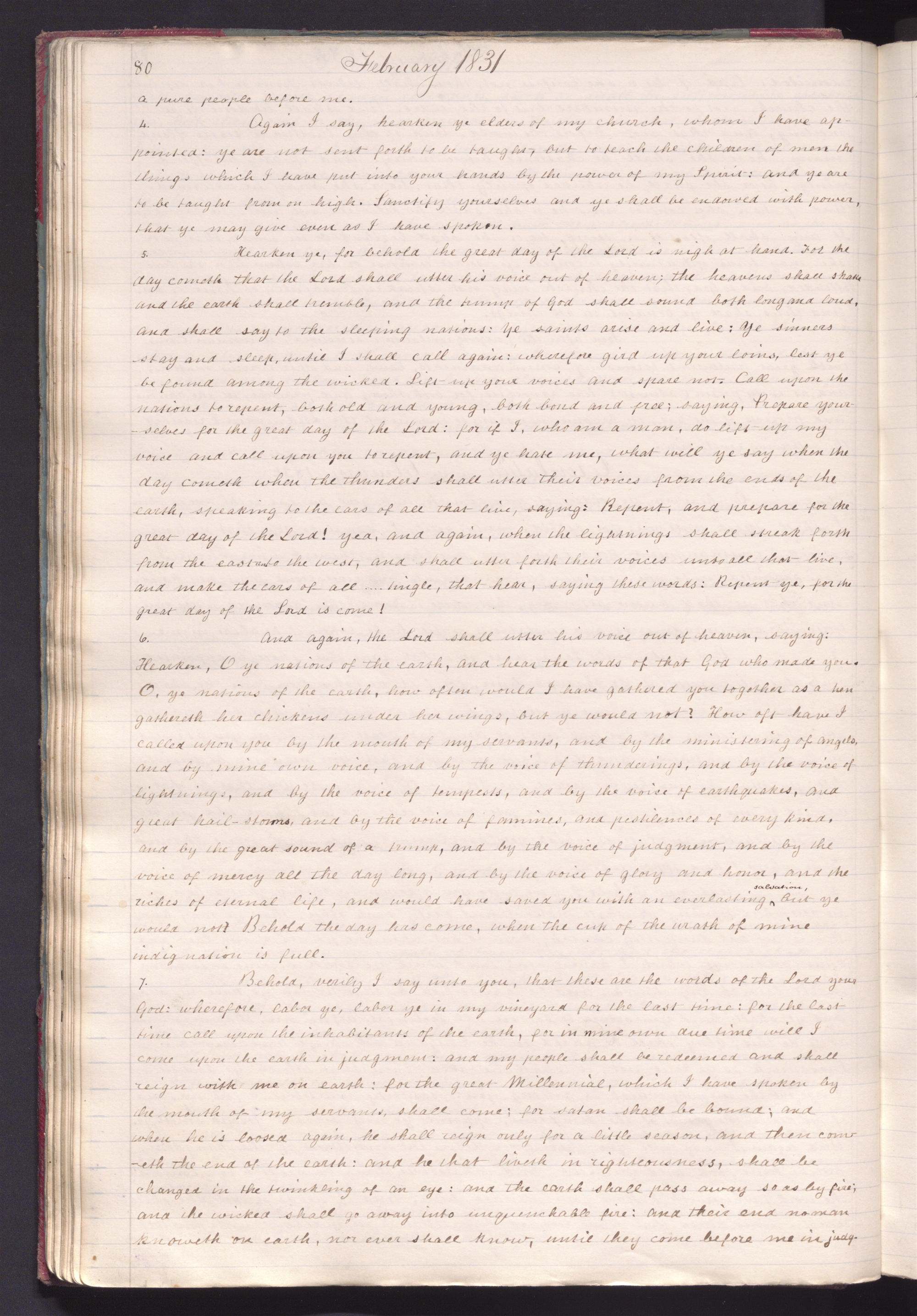 JS, History, 1838–1856, vol. A-2, created 4 Apr.–28 Nov. 1845 and 3–7 Aug. 1858; handwriting of , , , and ; 365 pages, plus seven pages of addenda; CHL. This is a copy of the first volume of a six-volume manuscript history of the church (JS History, 1838–1856, vol. A-1), and covers the period from 23 Dec. 1805 to 30 Aug. 1834. The copy also comprises four other volumes, labeled B-2, C-2, D-2, and E-2, and continues through 19 July 1843. The copy was discontinued 6 Aug. 1856 “by the advice of President ” (JS History, 1838–1856, vol. E-2, p. 83).