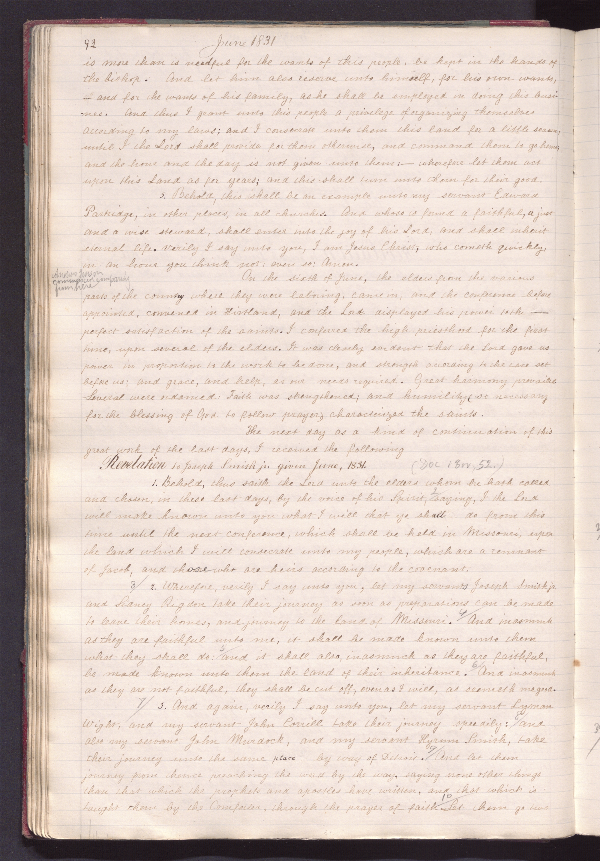 JS, History, 1838–1856, vol. A-2, created 4 Apr.–28 Nov. 1845 and 3–7 Aug. 1858; handwriting of , , , and ; 365 pages, plus seven pages of addenda; CHL. This is a copy of the first volume of a six-volume manuscript history of the church (JS History, 1838–1856, vol. A-1), and covers the period from 23 Dec. 1805 to 30 Aug. 1834. The copy also comprises four other volumes, labeled B-2, C-2, D-2, and E-2, and continues through 19 July 1843. The copy was discontinued 6 Aug. 1856 “by the advice of President ” (JS History, 1838–1856, vol. E-2, p. 83).