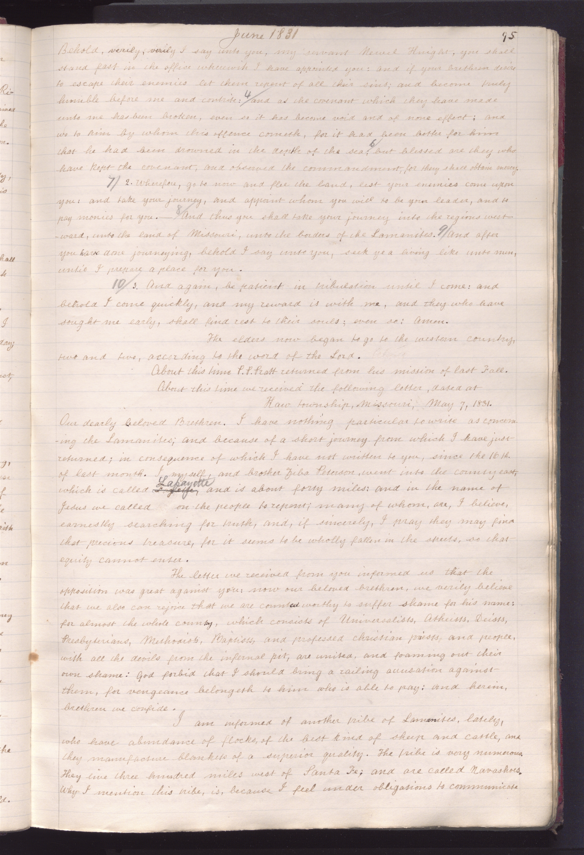 JS, History, 1838–1856, vol. A-2, created 4 Apr.–28 Nov. 1845 and 3–7 Aug. 1858; handwriting of , , , and ; 365 pages, plus seven pages of addenda; CHL. This is a copy of the first volume of a six-volume manuscript history of the church (JS History, 1838–1856, vol. A-1), and covers the period from 23 Dec. 1805 to 30 Aug. 1834. The copy also comprises four other volumes, labeled B-2, C-2, D-2, and E-2, and continues through 19 July 1843. The copy was discontinued 6 Aug. 1856 “by the advice of President ” (JS History, 1838–1856, vol. E-2, p. 83).