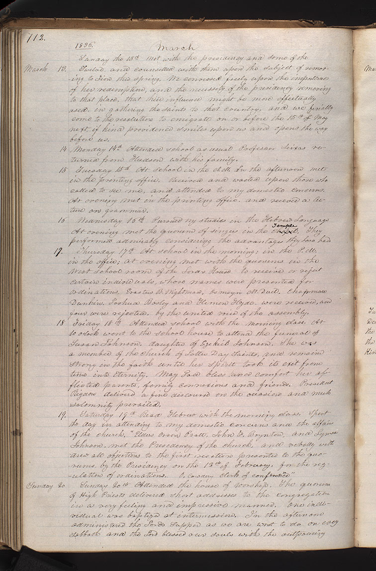 <19.> Saturday 19th. Read Hebrew with the morning class. Spent the day in attending to my domestic concerns and the affairs of the church. “Elders , , and , met the Presidency of the church, and verbally withdrew all objections to the first reso[lu]tion presented to the quorums, by the Presidency on the 12th of February, for the regulation of ordinations. Clerk of conference”