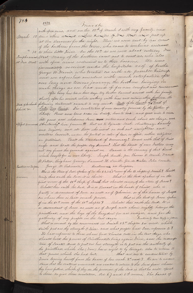 The narrative recorded in B-1 continued the story of JS’s life as the prophet and president of the church he labored to establish. The account encompasses significant developments in the church’s two centers at that time—, Ohio, and northwest —during a four-year-span. Critical events included the organization of the Quorums of the Twelve Apostles and the Seventy, the dedication of the House of the Lord in Kirtland, Ohio, the establishment of the Kirtland Safety Society, dissension and apostasy in Kirtland and Missouri, the first mission to England, JS’s flight from Kirtland to Missouri in the winter of 1838, the Saints’ exodus from Kirtland later that year, the disciplining of the Missouri presidency, and the outbreak of the Missouri War and arrest of JS. Thus, B-1 provides substantial detail regarding a significant period of church expansion and transition as well as travail.