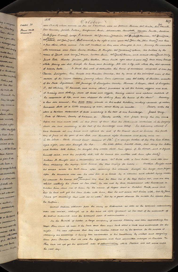 <October 30 Hauns Mill Massacre> was 18 or 19 whose names as far as I recollect, were as follows: , Levi <-[N.]-> Merrick , Josiah Fuller, , Alexander Campbell, , Sardius Smith -[aged 12 years]-, George S. Richards Mr. -[William]- Napier, Mr. -[Austin]- <Augestin> -[Augtistie]- Harmer, Mr. -[Simon]- Cox, Mr. , Mr. , Chas. Merrick -[a boy eight or nine years old]- -[John Lee, John Byers,]- and three or four others, whose names I do not recollect as they were strangers to me. Among the wounded who recovered were Isaac Laney, Nathan K. Knight, Mr. -[William]- Yokum, two brothers by the name of and George]- Myers, , Mr. , and several others (, -[Jacob Potts, Charles Jimison, John Walker, Alma Smith aged about 9 years old]- Miss Mary Stedwell while fleeing was shot thorough the hand, and fainting, fell over a log, into which they shot upwards of twenty balls. To finish their work of destruction this band of murderers composed of men from , , , Carroll and Counties, led by some of the principal men of that section of the Upper Country, (among whom I am informed were Mr. Ashby of , member of the State Legislature, Col. Jennings, of , Thomas O. Bryon, Clerk of , Mr. Whitney, Dr. Randall, and many others) proceeded to rob the houses, waggons and tents, of bedding and clothing, drove off horses and waggons, leaving widows and orphans destitute of the necessaries of life, and even stripped the clothing from the bodies of the slain! According to their own account, they fired seven rounds in this awful butchery, making upwards of sixteen hundred shots at a little company of men, about thirty in number. I hereby certify the above to be a true statement of facts according to the best of my knowledge. .