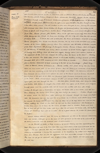 On the Thirtieth of October a large company of armed Soldiery were seen approaching . They came up near to the Town and then drew back about a mile and encamped for the night. We were informed that they were Militia, ordered out by the for the purpose of stopping our proceedings it having been represented to his Excellency by wicked and designing Men from , that we were the aggressors, and had committed outrages in &c They had not yet got the ’s order of [HC 3:187] extermination, which I believe did not arrive until the next day— [p. 847]