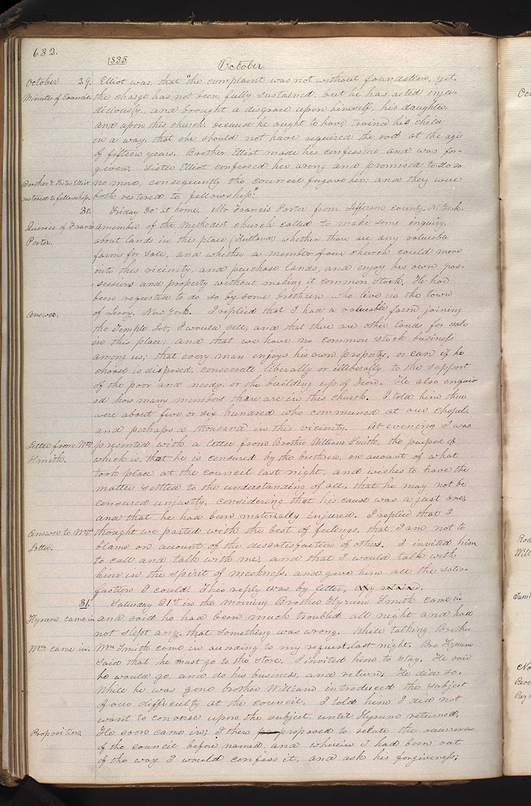 <30.> Friday 30 at home. Mr Francis Porter from , N. York. <Queries of Francis Porter.> a member of the Methodist church called to make some inquiry, about lands in this place () whether there are any valueable farms for sale, and whether a member of our church could move into this vicinity, and purchase lands, and enjoy his own possessions and property without making it common Stock. He had been requested to do so by some brethren who live in the town <Answer> of Leroy, New York. I replied that I had a valuable farm joining the Temple Lot, I would sell; and that there are other lands for sale in this place; and that we have no common stock business among us; that every man enjoys his own property, or can if he choose is disposed, conse[HC 2:295]crate liberally or illiberally to the support of the poor and needy, or the building up of Zion. He also enquired how many members there are in this church. I told him there were about five or six hundred who communed at our chapel, and perhaps a thousand in this vicinity. At evening I was <Letter from .> presented with a letter from Brother , the purport of which is, that he is censured by the brethren, on account of what took place at the council last night, and wishes to have the matter settled to the understanding of all, that he may not be censured unjustly, considering that his cause was a just one, and that he had been materially injured. I replied that I <Answer to ’s. Letter.> thought we parted with the best of feelings, that I am not to blame on account of the dissatisfaction of others. I invited him to call and talk with me, and that I would talk with him in the spirit of meekness, and give him all the satisfaction I could. This reply was by letter, copy retained.