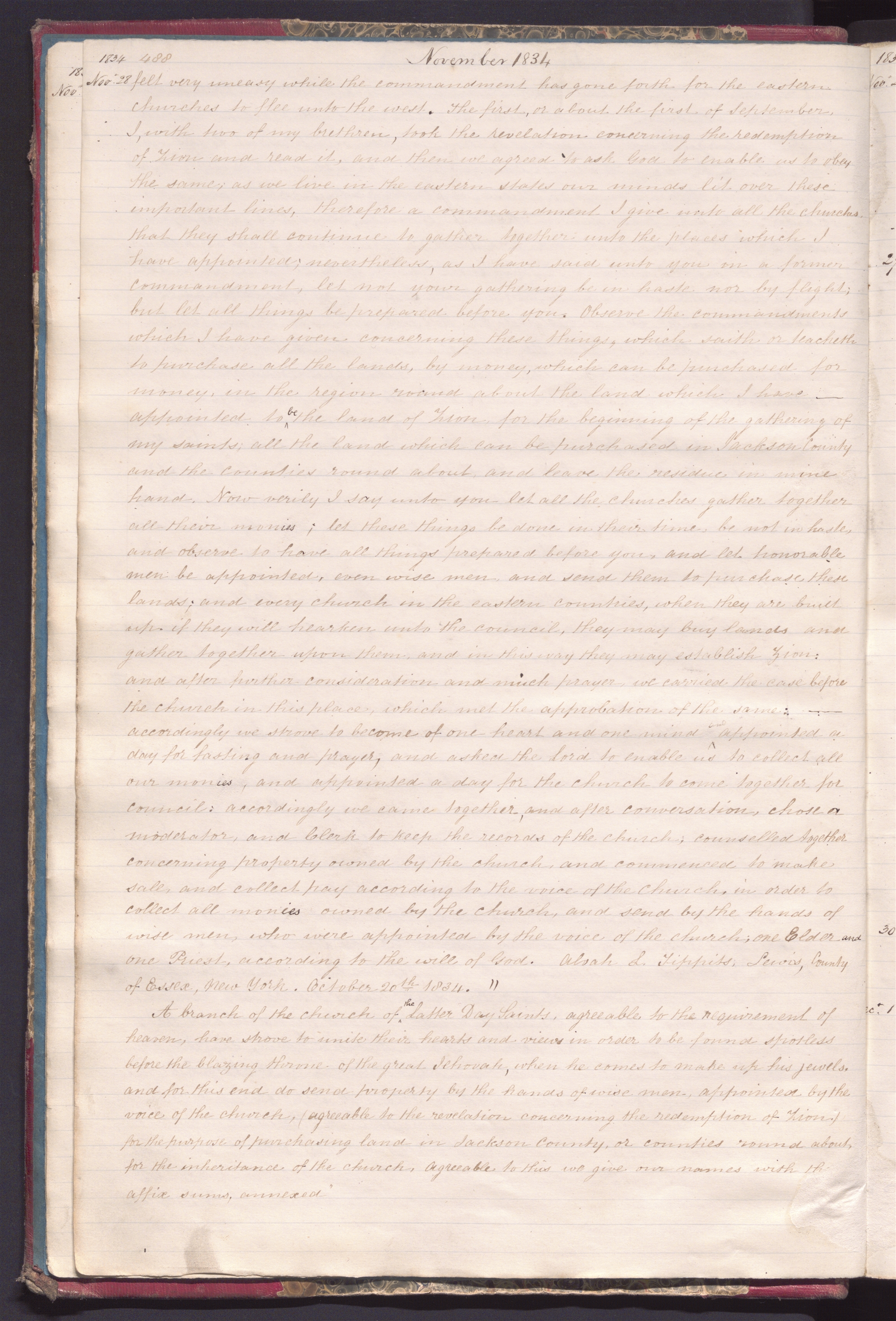 JS, History, 1838–1856, vol. B-2, created 16 May–22 Aug. 1845 and ca. 21 July 1854; handwriting of , , , Jonathan Grimshaw, and ; 296 pages, plus one page of addenda; CHL. This is a copy of the second volume of a six-volume manuscript history of the church (JS History, 1838–1856, vol. B-1), and covers the period from 1 Sept. 1834 to 2 Nov. 1838. The copy also comprises four other volumes, labeled A-2, C-2, D-2, and E-2, and continues through 19 July 1843. The copy was discontinued 6 Aug. 1856 “by the advice of President ” (JS History, 1838–1856, vol. E-2, p. 83).