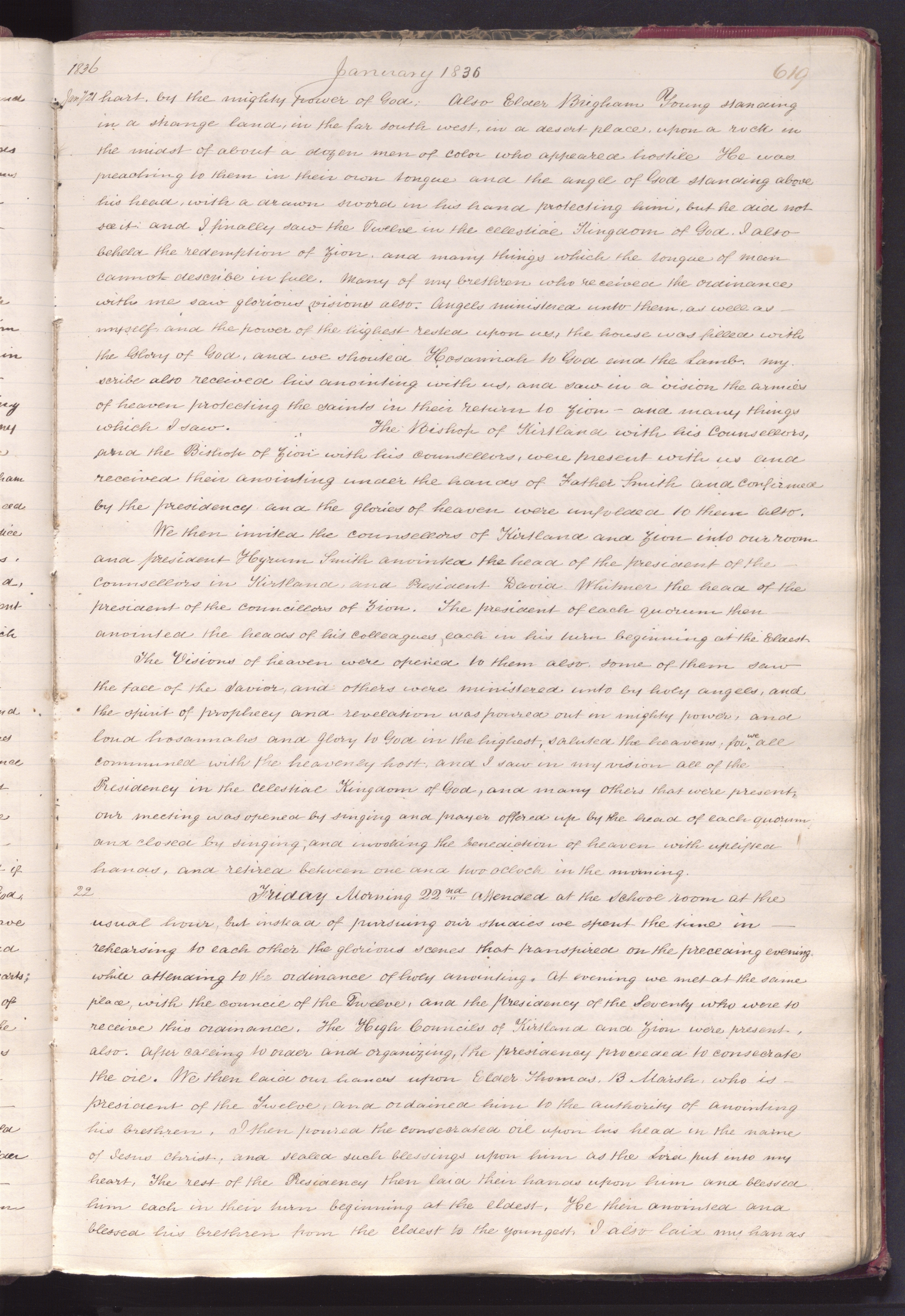 JS, History, 1838–1856, vol. B-2, created 16 May–22 Aug. 1845 and ca. 21 July 1854; handwriting of , , , Jonathan Grimshaw, and ; 296 pages, plus one page of addenda; CHL. This is a copy of the second volume of a six-volume manuscript history of the church (JS History, 1838–1856, vol. B-1), and covers the period from 1 Sept. 1834 to 2 Nov. 1838. The copy also comprises four other volumes, labeled A-2, C-2, D-2, and E-2, and continues through 19 July 1843. The copy was discontinued 6 Aug. 1856 “by the advice of President ” (JS History, 1838–1856, vol. E-2, p. 83).