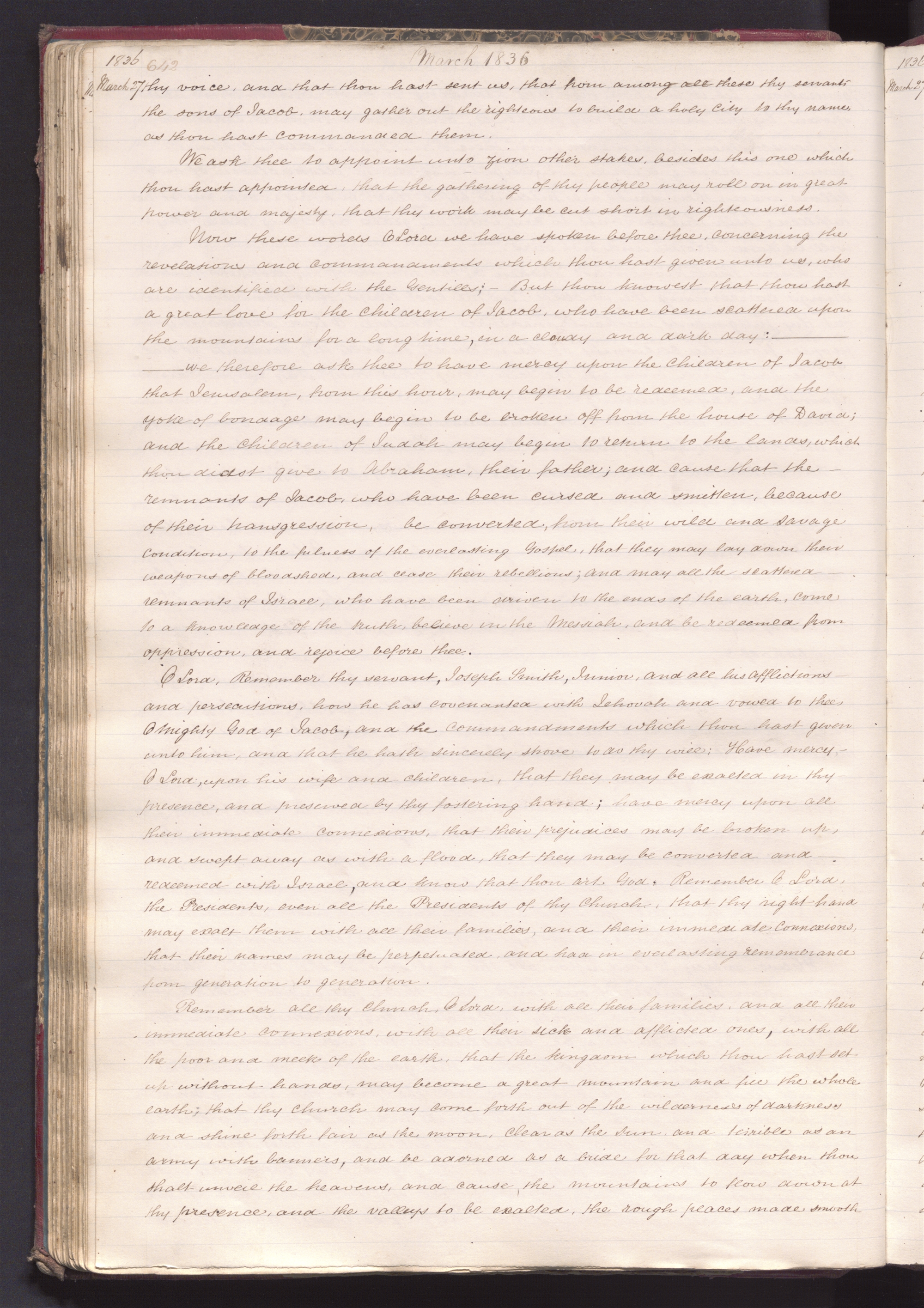 JS, History, 1838–1856, vol. B-2, created 16 May–22 Aug. 1845 and ca. 21 July 1854; handwriting of , , , Jonathan Grimshaw, and ; 296 pages, plus one page of addenda; CHL. This is a copy of the second volume of a six-volume manuscript history of the church (JS History, 1838–1856, vol. B-1), and covers the period from 1 Sept. 1834 to 2 Nov. 1838. The copy also comprises four other volumes, labeled A-2, C-2, D-2, and E-2, and continues through 19 July 1843. The copy was discontinued 6 Aug. 1856 “by the advice of President ” (JS History, 1838–1856, vol. E-2, p. 83).