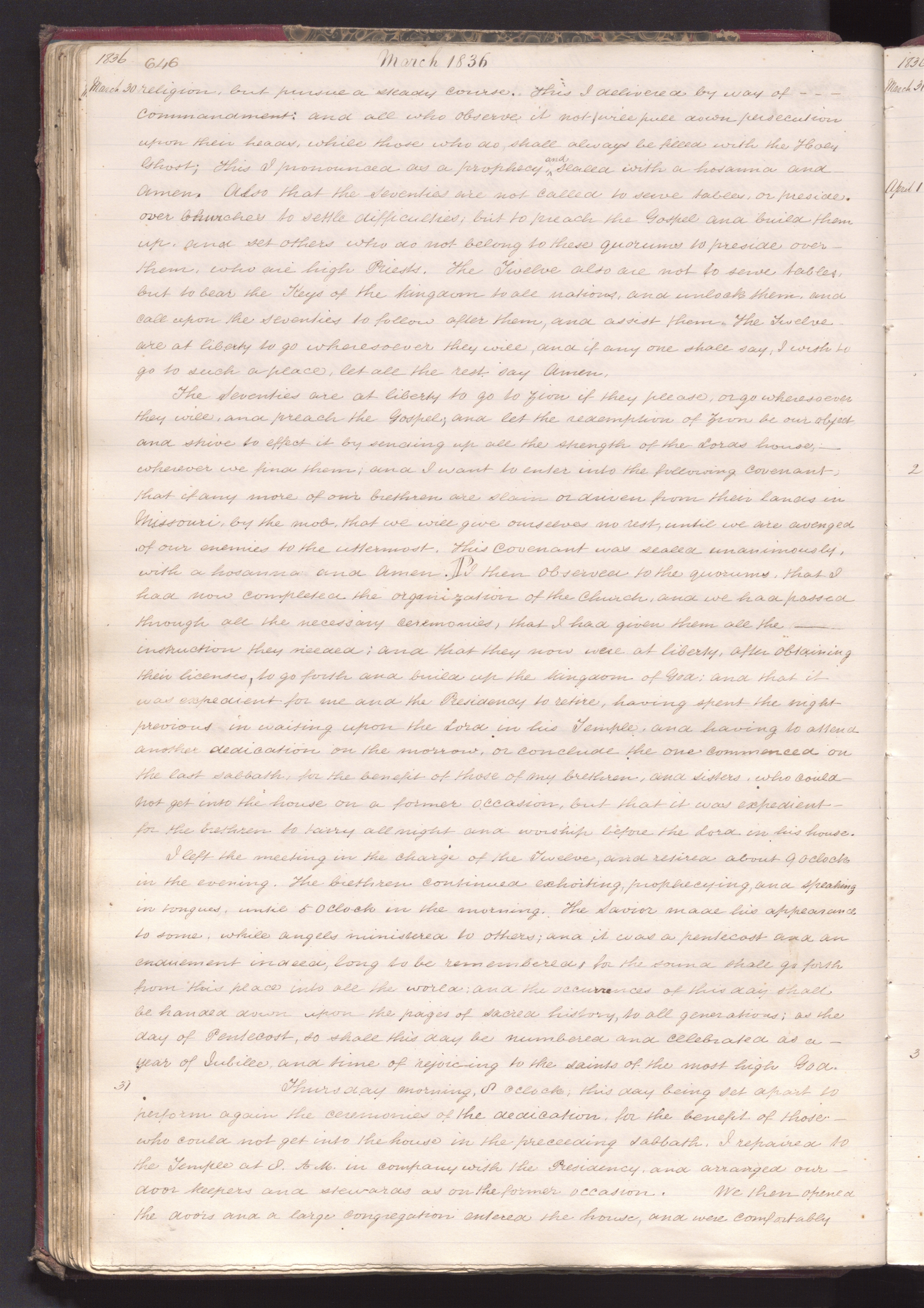 JS, History, 1838–1856, vol. B-2, created 16 May–22 Aug. 1845 and ca. 21 July 1854; handwriting of , , , Jonathan Grimshaw, and ; 296 pages, plus one page of addenda; CHL. This is a copy of the second volume of a six-volume manuscript history of the church (JS History, 1838–1856, vol. B-1), and covers the period from 1 Sept. 1834 to 2 Nov. 1838. The copy also comprises four other volumes, labeled A-2, C-2, D-2, and E-2, and continues through 19 July 1843. The copy was discontinued 6 Aug. 1856 “by the advice of President ” (JS History, 1838–1856, vol. E-2, p. 83).