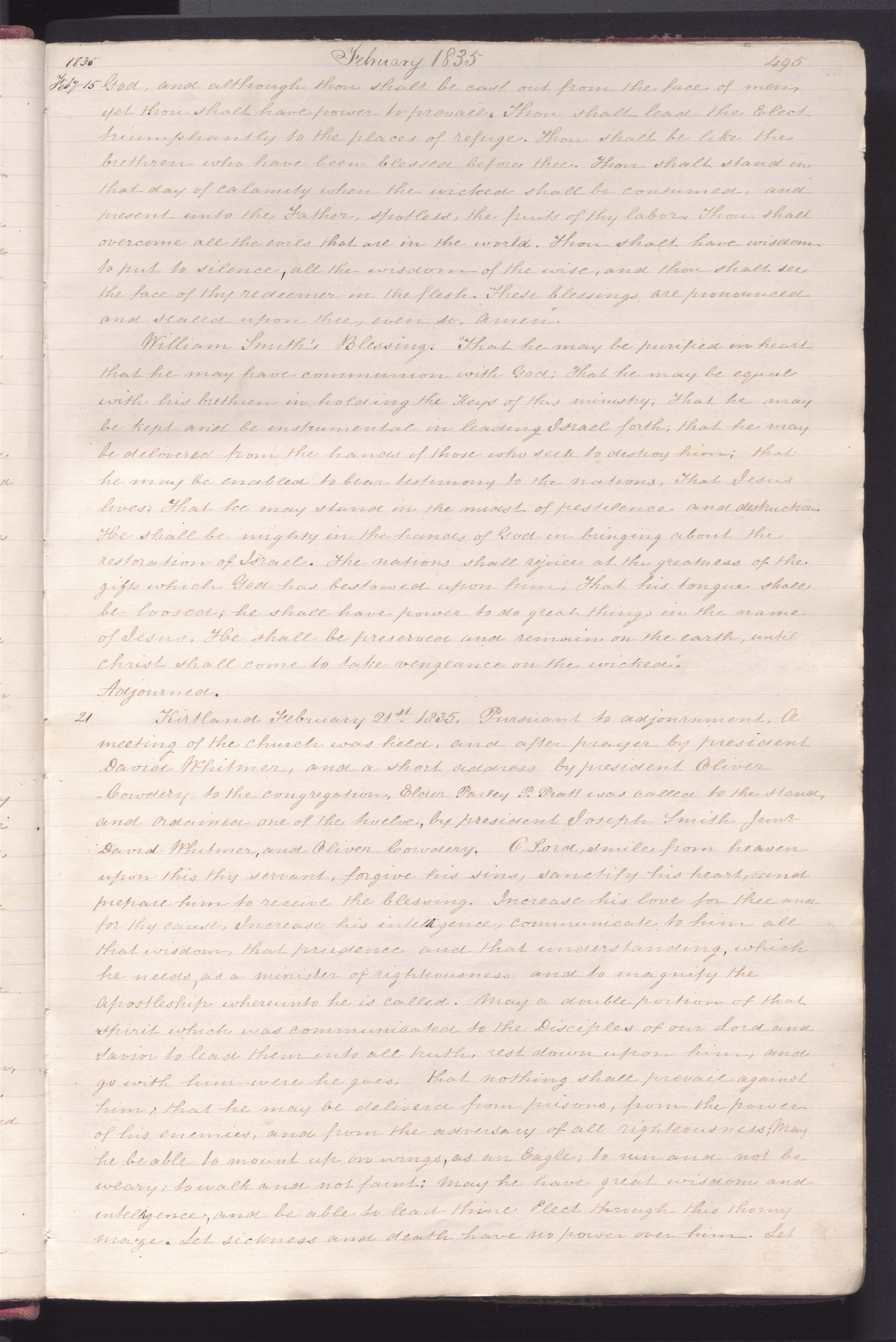 JS, History, 1838–1856, vol. B-2, created 16 May–22 Aug. 1845 and ca. 21 July 1854; handwriting of , , , Jonathan Grimshaw, and ; 296 pages, plus one page of addenda; CHL. This is a copy of the second volume of a six-volume manuscript history of the church (JS History, 1838–1856, vol. B-1), and covers the period from 1 Sept. 1834 to 2 Nov. 1838. The copy also comprises four other volumes, labeled A-2, C-2, D-2, and E-2, and continues through 19 July 1843. The copy was discontinued 6 Aug. 1856 “by the advice of President ” (JS History, 1838–1856, vol. E-2, p. 83).