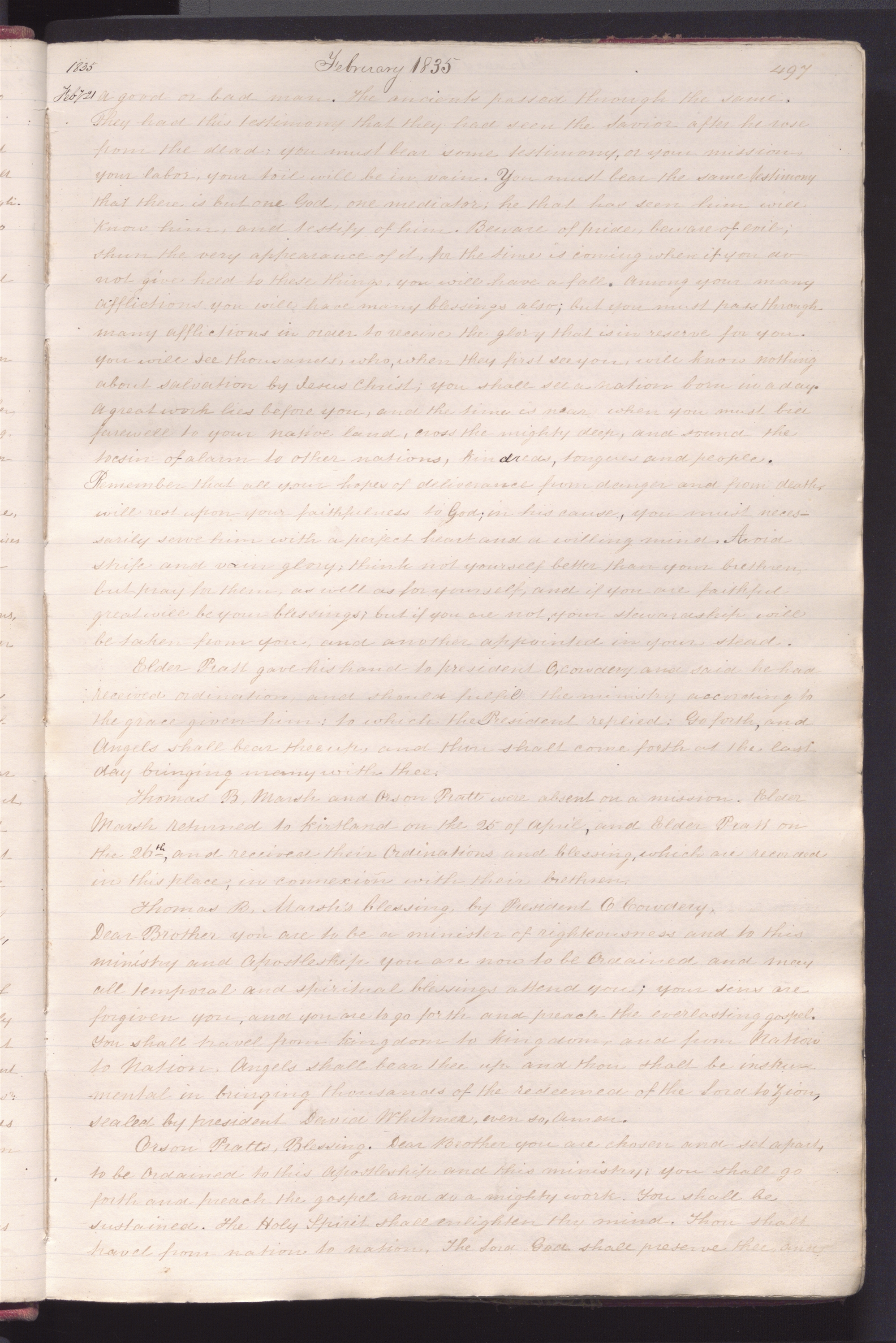 JS, History, 1838–1856, vol. B-2, created 16 May–22 Aug. 1845 and ca. 21 July 1854; handwriting of , , , Jonathan Grimshaw, and ; 296 pages, plus one page of addenda; CHL. This is a copy of the second volume of a six-volume manuscript history of the church (JS History, 1838–1856, vol. B-1), and covers the period from 1 Sept. 1834 to 2 Nov. 1838. The copy also comprises four other volumes, labeled A-2, C-2, D-2, and E-2, and continues through 19 July 1843. The copy was discontinued 6 Aug. 1856 “by the advice of President ” (JS History, 1838–1856, vol. E-2, p. 83).