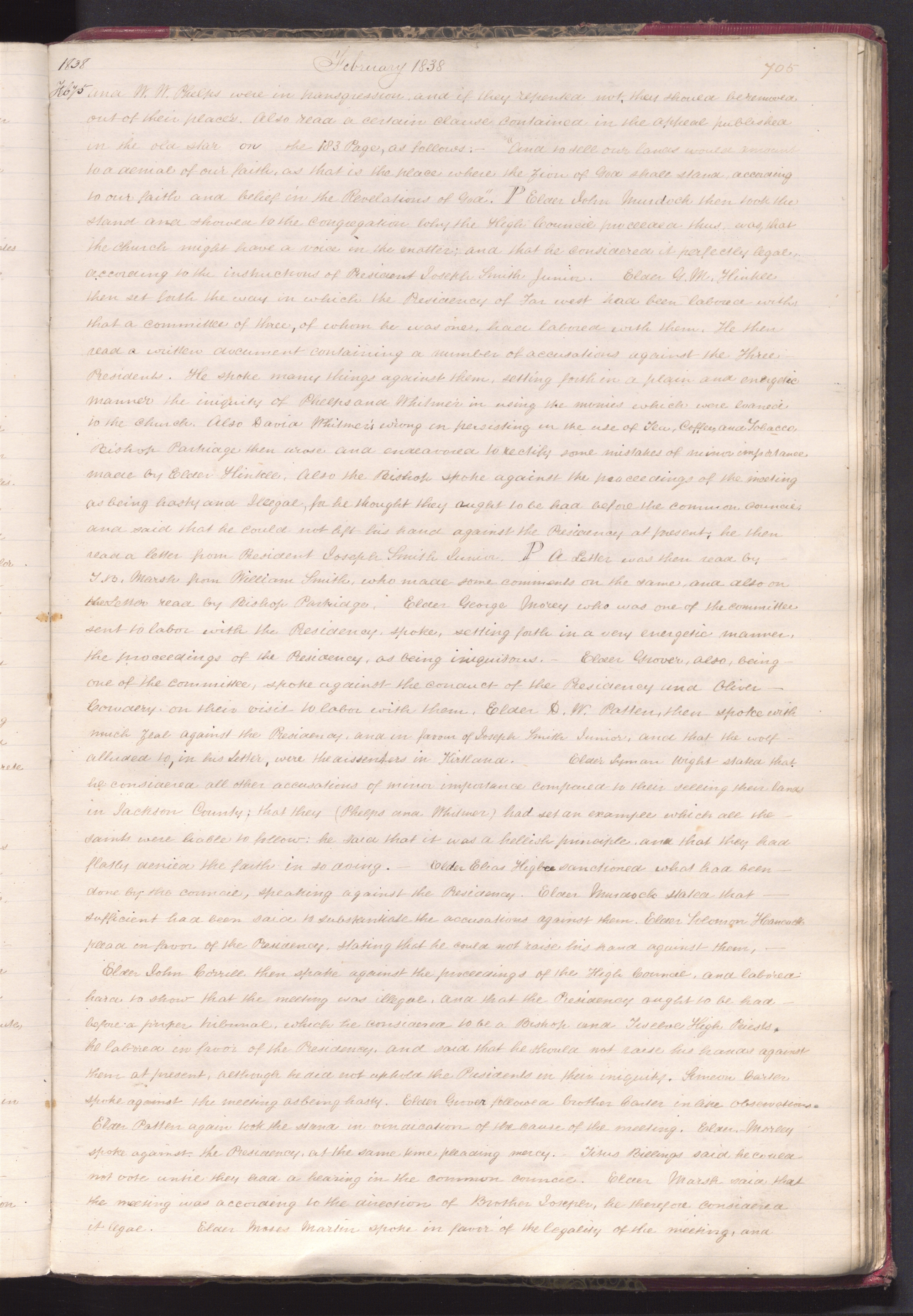 JS, History, 1838–1856, vol. B-2, created 16 May–22 Aug. 1845 and ca. 21 July 1854; handwriting of , , , Jonathan Grimshaw, and ; 296 pages, plus one page of addenda; CHL. This is a copy of the second volume of a six-volume manuscript history of the church (JS History, 1838–1856, vol. B-1), and covers the period from 1 Sept. 1834 to 2 Nov. 1838. The copy also comprises four other volumes, labeled A-2, C-2, D-2, and E-2, and continues through 19 July 1843. The copy was discontinued 6 Aug. 1856 “by the advice of President ” (JS History, 1838–1856, vol. E-2, p. 83).