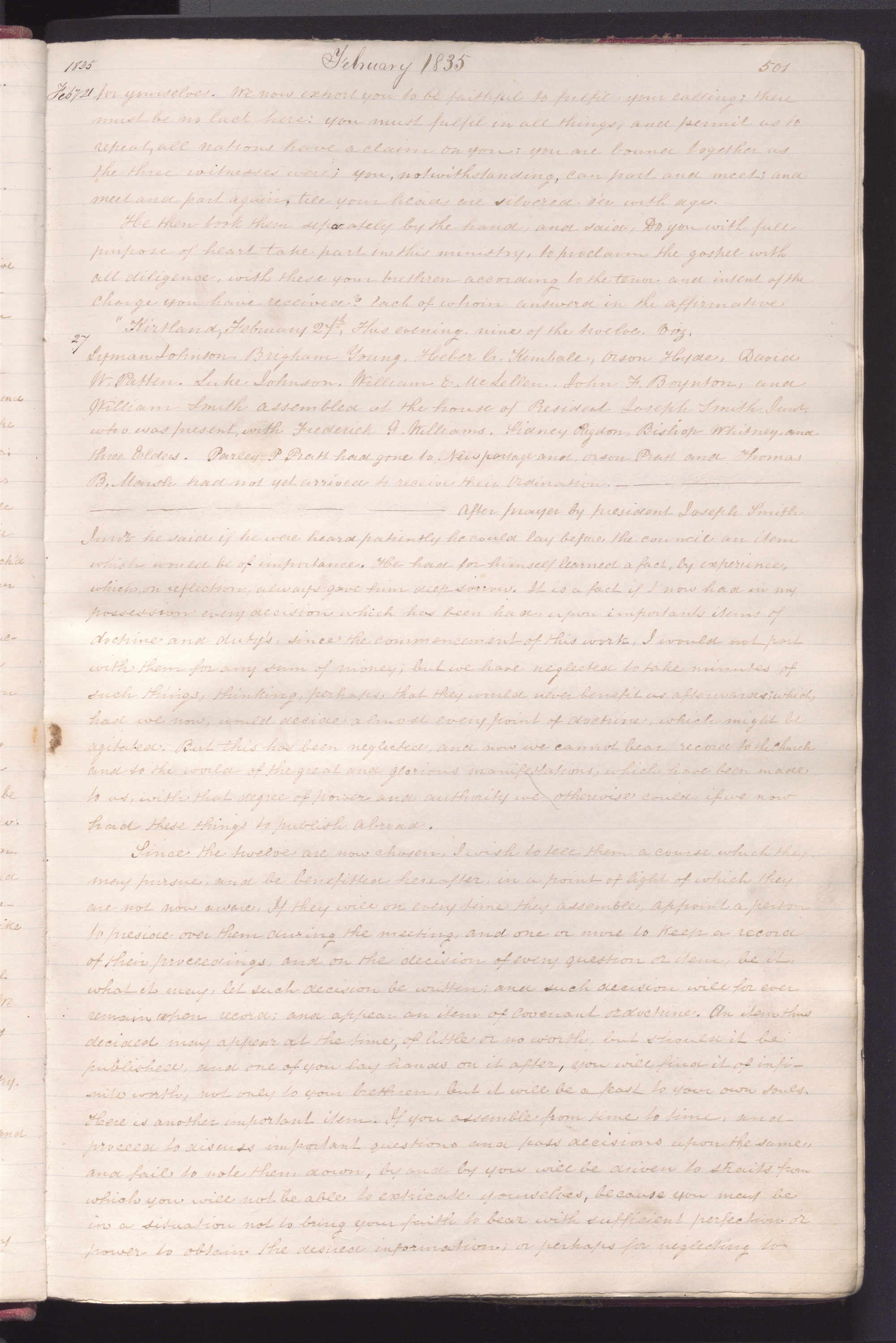 JS, History, 1838–1856, vol. B-2, created 16 May–22 Aug. 1845 and ca. 21 July 1854; handwriting of , , , Jonathan Grimshaw, and ; 296 pages, plus one page of addenda; CHL. This is a copy of the second volume of a six-volume manuscript history of the church (JS History, 1838–1856, vol. B-1), and covers the period from 1 Sept. 1834 to 2 Nov. 1838. The copy also comprises four other volumes, labeled A-2, C-2, D-2, and E-2, and continues through 19 July 1843. The copy was discontinued 6 Aug. 1856 “by the advice of President ” (JS History, 1838–1856, vol. E-2, p. 83).